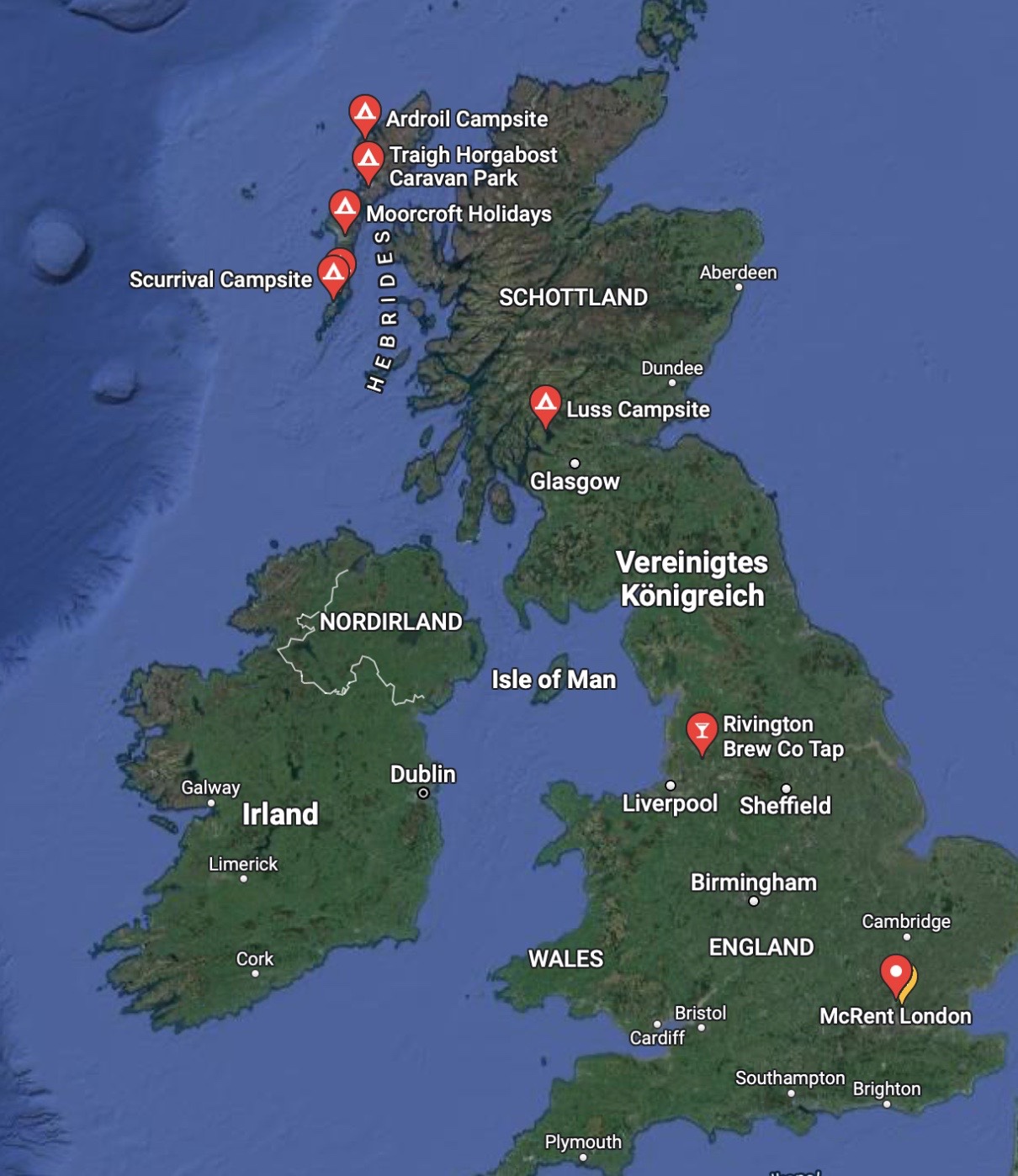 Ich habe mal unsere ersten Stops von unserem Schottland Trip auf der Karte abgesteckt.