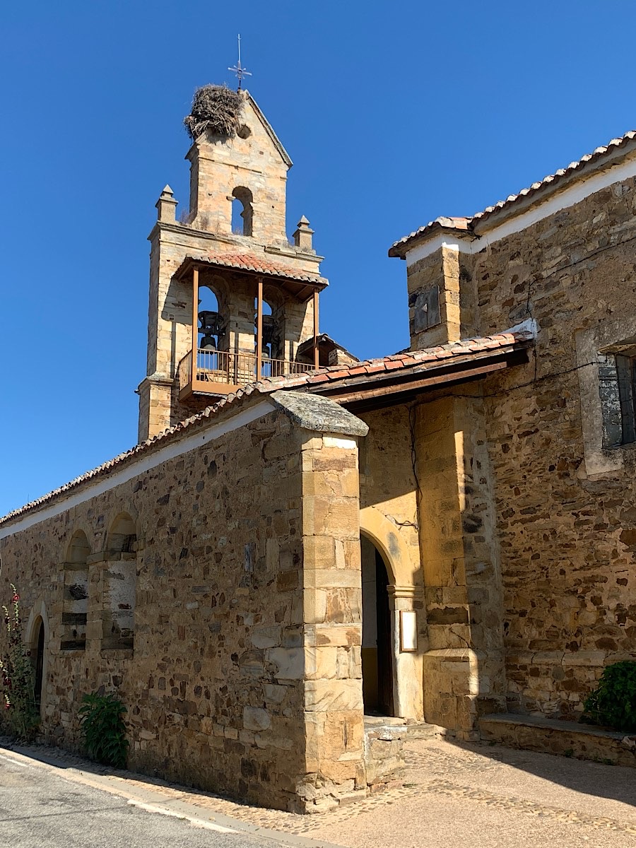 In dem kleinen Straßendorf El Ganso steht eine schöne alte Pfarrkirche mit einem Storchennest auf dem Turm. Vor den mittelalterlichen Steinhäusern blühen Stockrosen, die Sonne scheint, die Vögel zwitschern. Hier ist auch ein kleiner Supermarkt, der Sachen wie Reis, Haferflocken, getrocknetes Obst und Dosen mit Erbsen oder Pilzen in kleinen Portionen anbietet, speziell für Pilger ausgerichtet. Mit dem Fokus auf meine Verdauung kaufe ich einen Naturjoghurt, Haferflocken und Backpflaumen und schlemme die gesunde Köstlichkeit draußen im Sitzbereich des Cafés.