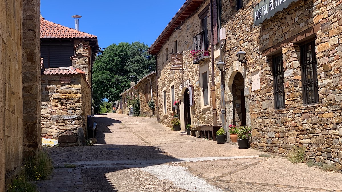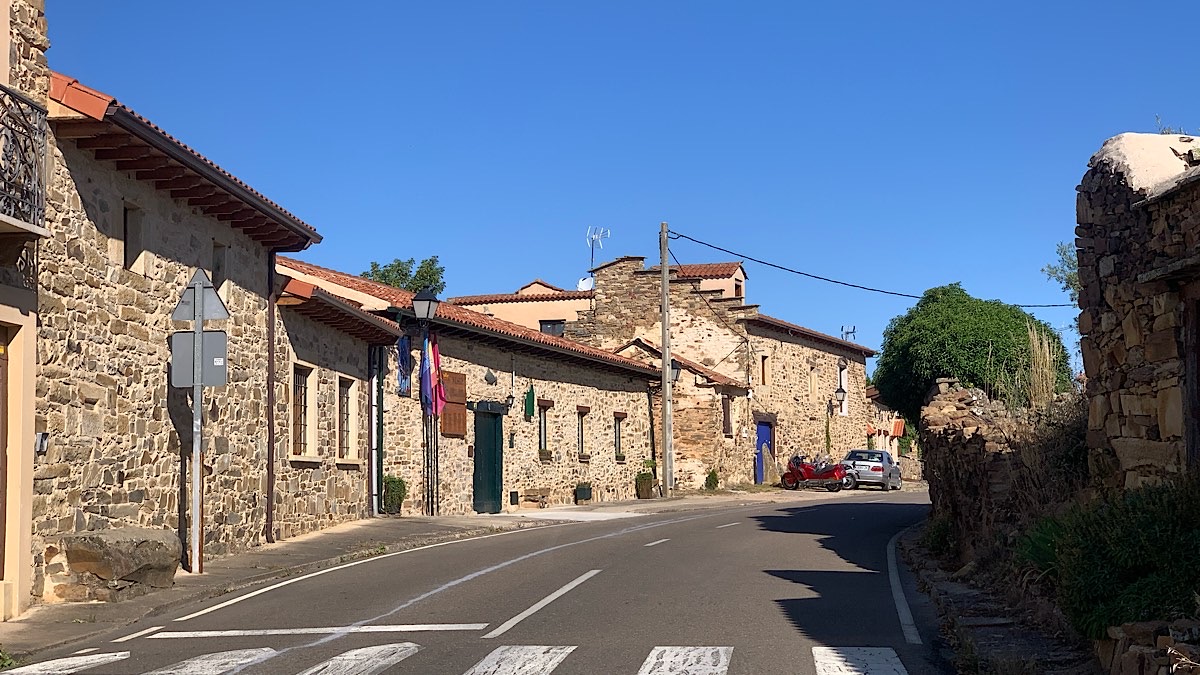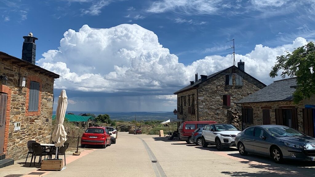 Foncebadón ist ein Bergdorf auf knappen 1500 Metern über dem Meeresspiegel. Es wurde zu Anfang des neunzehnten Jahrhunderts im Unabhängigkeitskrieg gegen die napoleonischen Truppen zerstört und hinterher wieder aufgebaut. In den achtziger Jahren sank die Einwohnerzahl auf Null und wurde mit all seinen Ruinen sozusagen zum Geisterdorf. Bekannt war das Dorf auch durch seine vielen wilden Hunde, vor denen die meisten Pilger selbst vor wenigen Jahren noch höllische Angst hatten. Irgendwann wurden die Hunde wohl aber alle eingefangen, seitdem gibt es auf dem gesamten Jakobsweg keine mehr. Dank des Caminos ist Foncebadón überhaupt wieder besiedelt, wenn auch im Winter nur im niedrigen zweistelligen Bereich. Eigentlich ist Foncebadón nur eine einzige Bergstraße mit kleinen Häusern links und rechts und gemütlich aussehenden Herbergen und Cafés. Zu Beginn der Straße stehen jedoch nach wie vor nur Ruinen, die zerfallenen Steinmauern sind teilweise komplett zugewachsen.