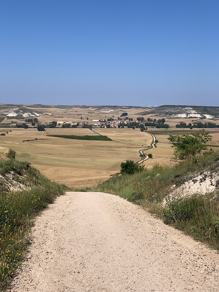 Erst zehn Kilometern hinter Burgos erreiche ich das nächste Dorf und sehe auch den ersten Pilger. Und erst hier bekomme ich meinen lang ersehnten Milchkaffee in einer Bar, in der sämtliche Einheimische sitzen und Cognac trinken. Kann man ja machen um acht Uhr morgens. Zum Essen gibt es hier nichts außer ein trockenes Croissant unter einer Käseglocke auf der Theke und ein paar Oliven. Zum Glück habe ich noch einen Pfirsich, ein paar Kekse und etwas Käse.