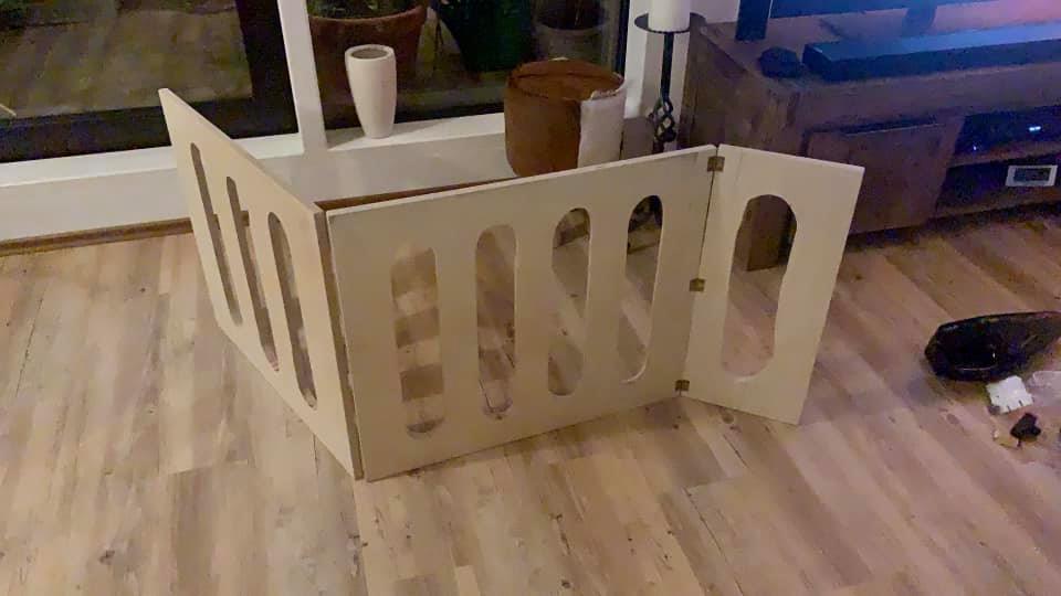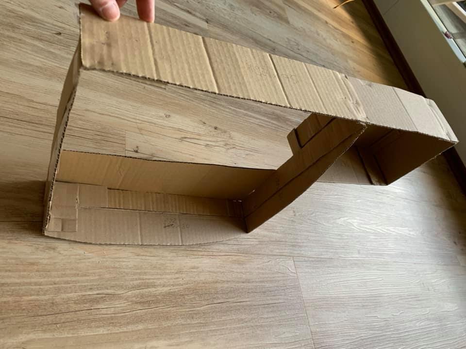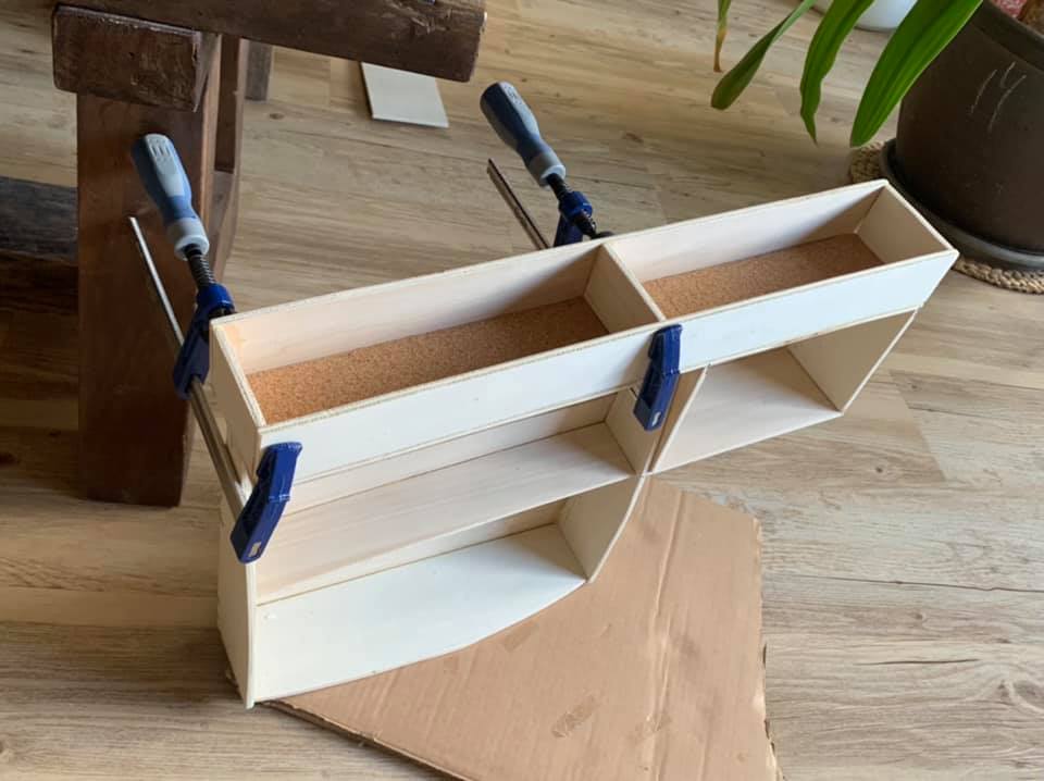 David hat nur noch mit dem Kopf geschüttelt, als ich als nächstes einen Dummy aus Pappe für ein Regal für die Armlehne bastelte. Aus 6 mm Pappelsperrholz sägte ich mit der Stichsäge die Teile zurecht. Natürlich hatte am Ende kein Teil eine gerade Kante, und kleben war dadurch unmöglich. Also tackerte ich den ganzen Spaß zusammen und verpaßte dem guten Stück anschließend noch eine Schicht Briwax.