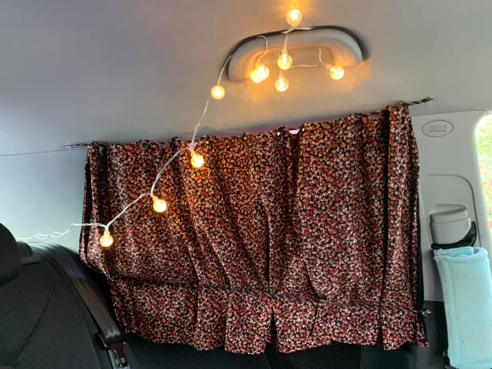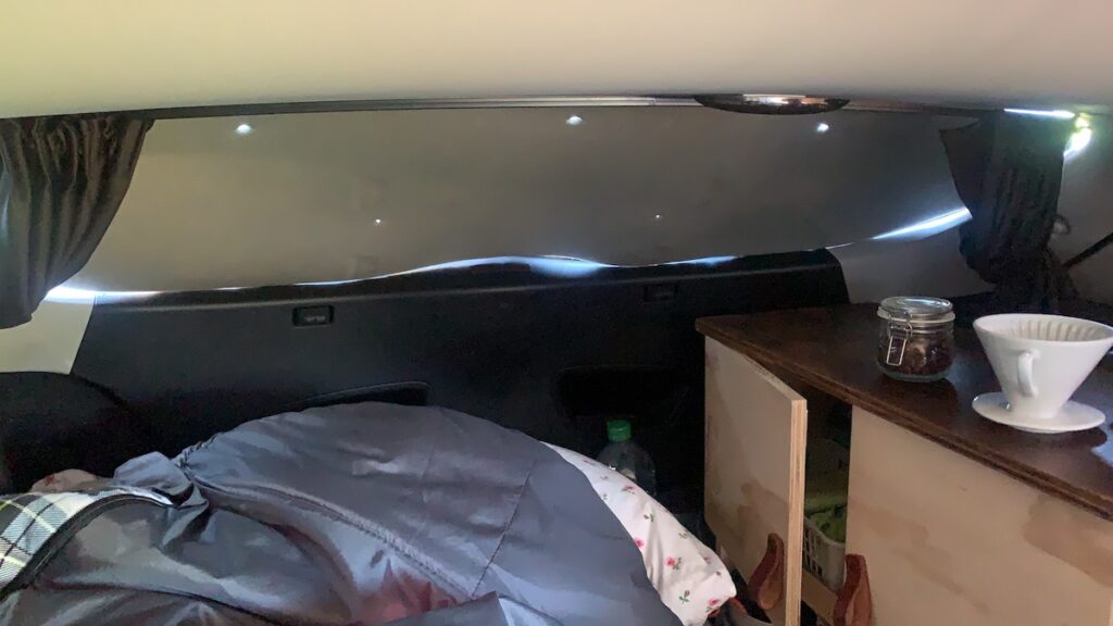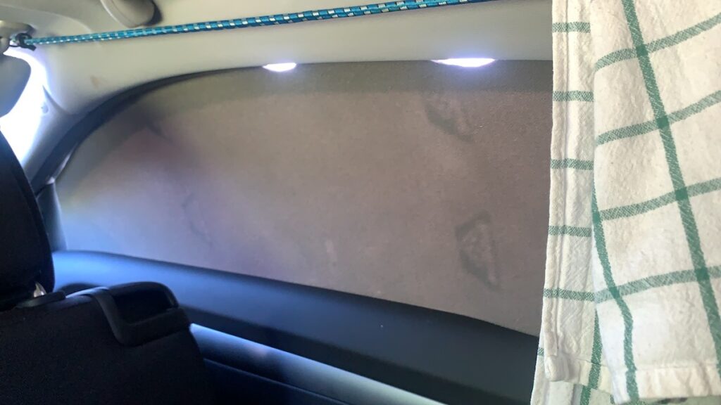 Für die Heckscheibe hatte ich eine Zeit lang noch diesen … ich sag mal Sichtschutz. Zum Abdunkeln war das nichts. Die Schienen waren mit doppelseitigem Klebeband an die Decke der Kofferraumklappe geklebt, und in regelmäßigen Abständen habe ich die Vorhänge im Schlaf mit meinen Füßen runter getreten. Sie dienten allerdings noch lange als Deko, denn zusammengebunden an den Seiten gaben sie immer ein gemütliches Bild.