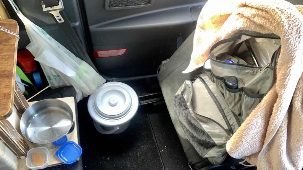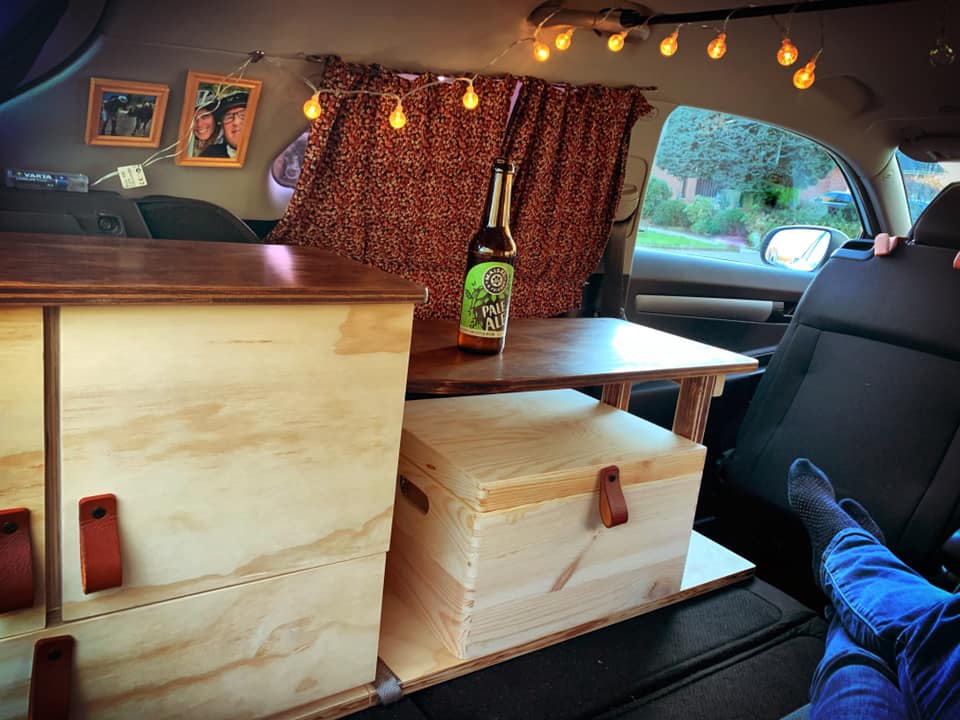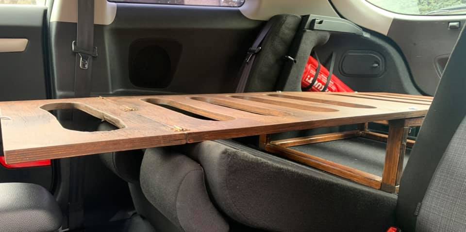 Meine Rücksitzbank ist teilbar, so daß ich den einfachen Sitz stehen lassen konnte, um dort zu sitzen, bevor ich schlafen ging. Aber ohne Tisch ist doof, also baute ich etwas zum Herunterklappen, ähnlich wie die Tische im Flugzeug. Das war ok und klappte gut.