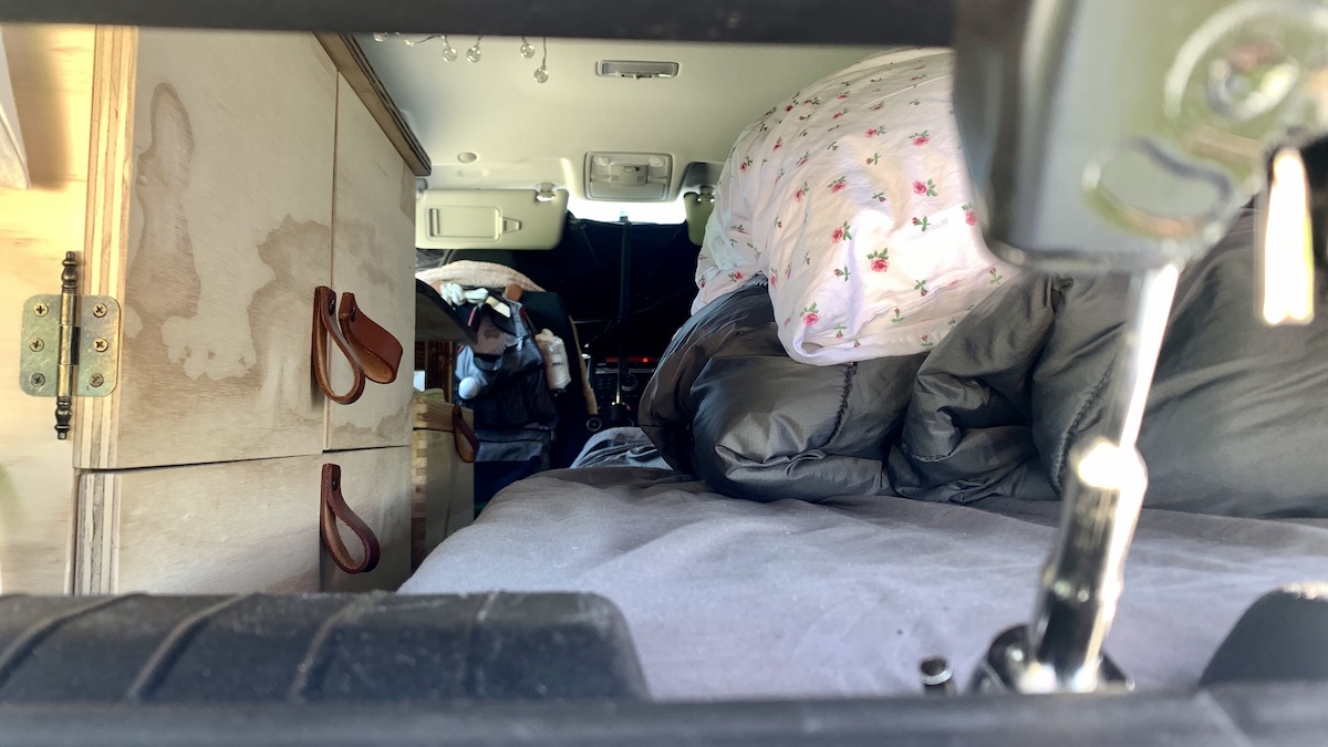 Da hatte ich mir so einen tollen Rahmen und Gestell für mein Bett gebaut, nur um Wochen später festzustellen, daß ich meine Sitzbank rausnehmen und dadurch die Rückenlehnen komplett umklappen kann!! Das war im Januar 2021. Auf einmal konnte ich die Matratze direkt ohne Rahmen auf die entstandene Fläche legen, und hatte dadurch nach oben hin richtig viel Platz. Jetzt konnte ich sogar im Bett sitzen, was vorher nicht ging.