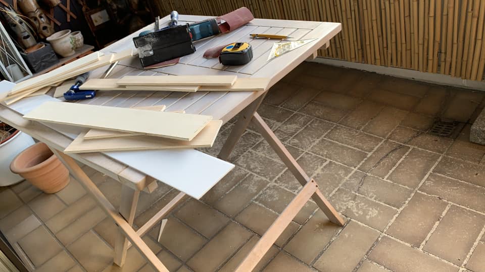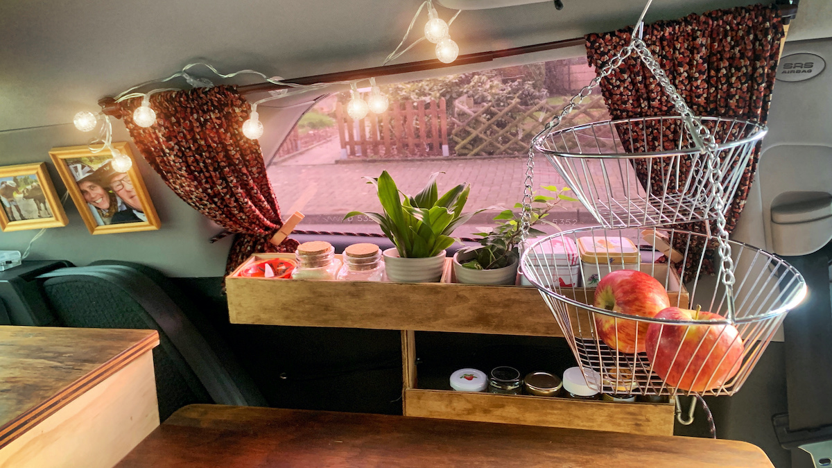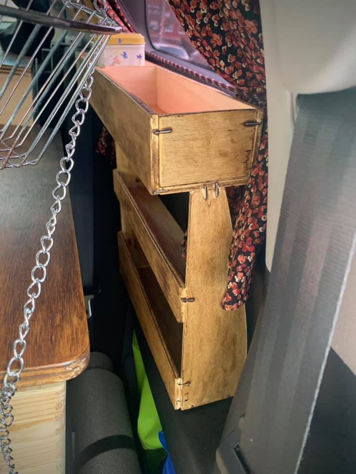 Weil ich jetzt auf einmal so viel Platz hatte, kam mir der Gedanke, daß ich doch was richtig tolles bauen könnte. Animiert durch ein YouTube Video bestellte ich online Holz im Baumarkt (die zweite Coronawelle war gerade im vollen Gange, und Baumärkte waren für mich nicht zugänglich) und fing an mir einen Schrank zu bauen. Mein kleines Klapptischchen hinter dem Fahrersitz war nun auch hinfällig, denn ich baute mir eine ganz neue Konstruktion.