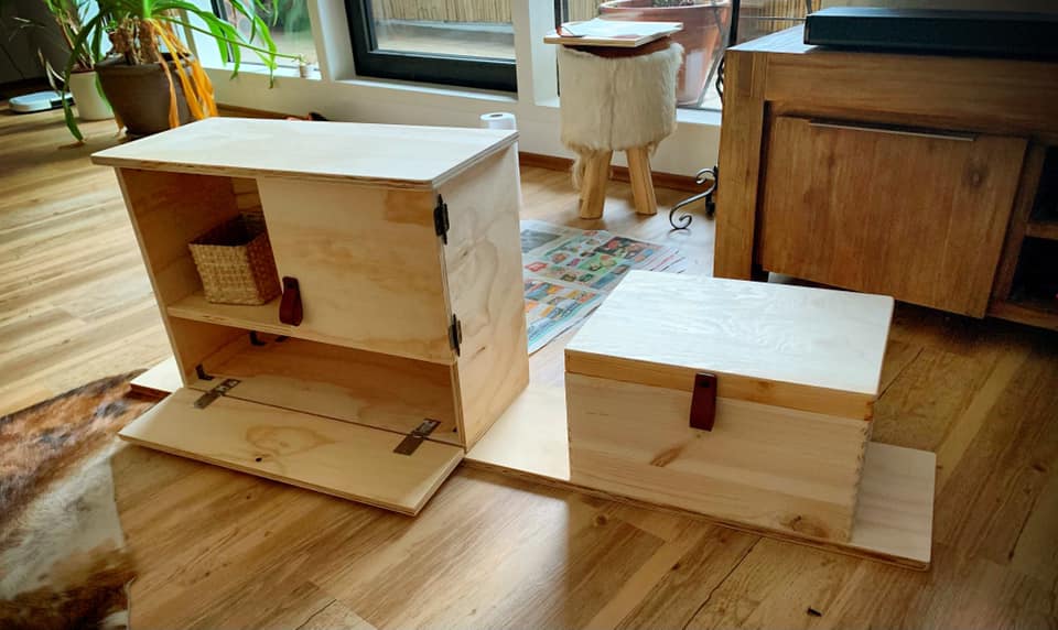 Neben dem Schränkchen steht jetzt eine Holzbox, und darüber ist mein neuer Tisch eingehakt.