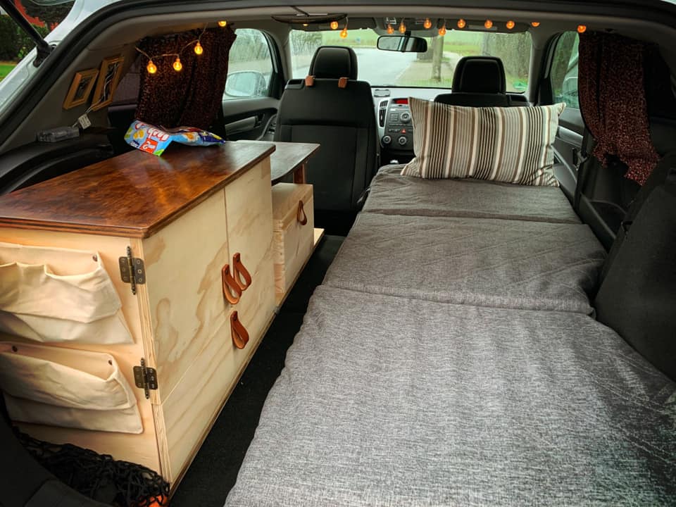 Die Idee, meinen Kia in einen Minicamper zu verwandeln, kam mir sehr spät. Zu diesem Zeitpunkt hatte ich schon oft in meinem Auto geschlafen – nach Parties, vor dem Frühdienst oder nach einer harten Langstrecke. Da lag ich dann entweder zusammengekauert auf der Rückbank, oder krumm und schief im Kofferraum, einfach mit Decken ausgepolstert und ohne jeglichen Komfort. Daß mir danach alle Knochen weh taten und ich auch nicht wirklich ausgeschlafen war versteht sich von selbst.
