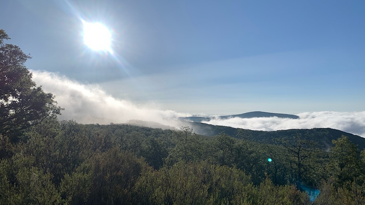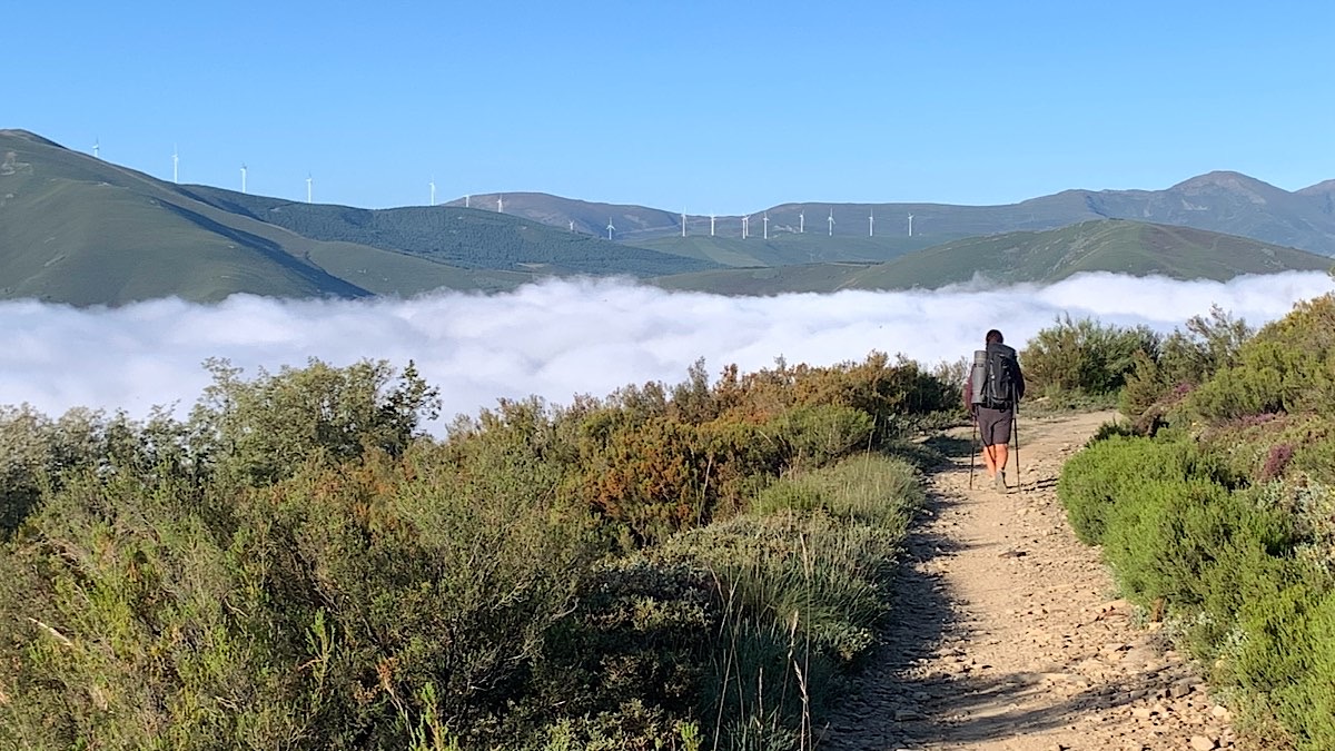 Wir reden wahnsinnig viel, teilweise auch recht skurriles Zeug, und manchmal kann ich Angela nicht zu hundert Prozent folgen. Will ich manchmal auch gar nicht, weil ich nicht abgelenkt werden möchte von der Schönheit des Weges hier hoch oben in den Montes de León. Es ist so unglaublich schön, wir bewegen uns knapp über der Wolkendecke, und überall duftet es nach diversen Kräutern. Ich kann gar nicht genug bekommen von all diesen Glücksgefühlen, die mich durchströmen, und eigentlich wäre ich tatsächlich gerne alleine im Hier und Jetzt. Dann wiederum ist es aber auch schön den Moment mit jemandem teilen zu können, wenn dieser Jemand mal für einen Moment den Mund halten würde. Schließlich erzählt Angela mir die Geschichte von einem ihrer Erlebnisse auf dem Camino, die mich etwas sprachlos zurück lässt, und die geht so: