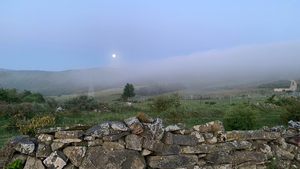 Es ist noch nicht ganz hell, als ich schnellen Schrittes die einhundert Höhenmeter den Monte Irago rauf in Richtung des berühmten Cruz de Ferro eile. Ich friere und wünschte, ich hätte mich wärmer angezogen. Es sind nur elf Grad, aber der Wind lässt es kälter wirken. Frösche quaken, Nebelschwaden umhüllen die Berge, und es ist Vollmond. Ich versuche die Atmosphäre fotografisch festzuhalten, aber das gespenstisch schöne kommt auf den Bildern überhaupt nicht zur Geltung.