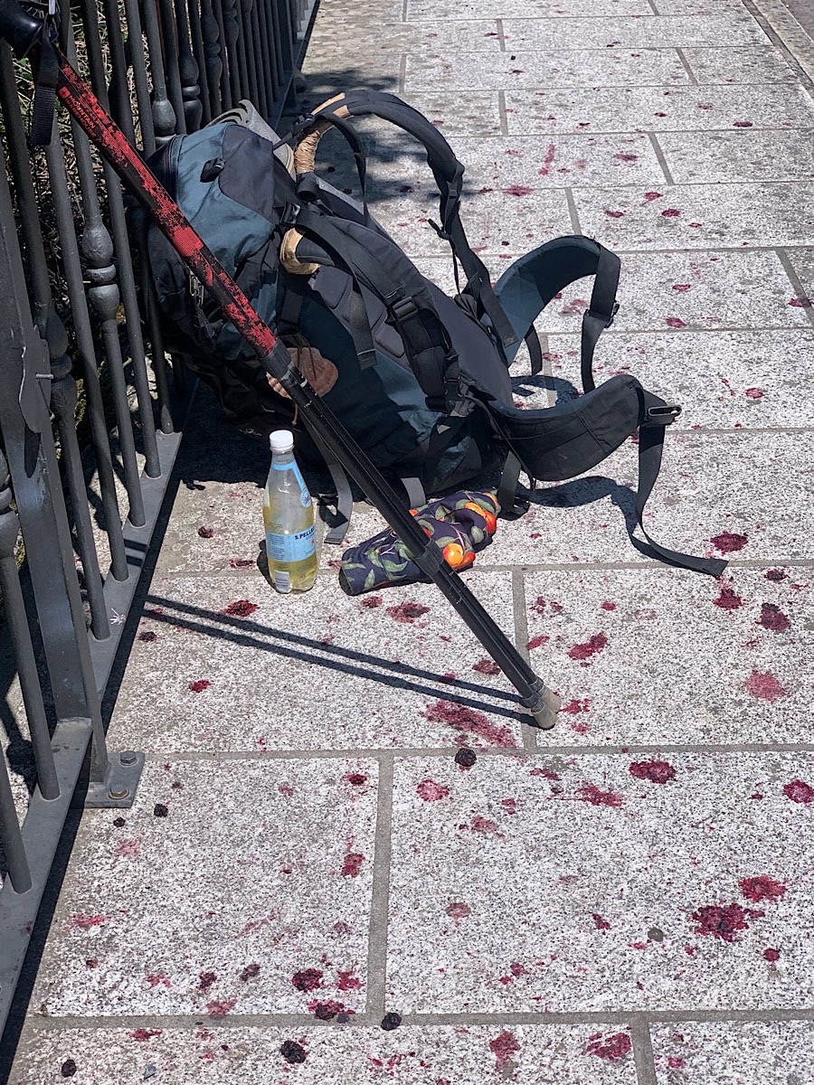Kurz vor Molinaseca ist Angela plötzlich wieder hinter mir. Sie hat für eine ganze Weile in einer Kapelle gesessen, und in der Zeit habe ich sie offenbar überholt. Gemeinsam erreichen wir das malerische Dorf, als wir an einem Maulbeerbaum vorbei kommen, der hinter einem Geländer an einem Abhang steht. Also, ich bin manchmal schon bescheuert, aber Angela übertrifft mich bei weitem. Sie klettert über das Geländer und den Maulbeerbaum hoch, um an die Früchte zu kommen. Wie ein Affe hängt sie mit ihren sechzig Jahren in diesem Baum, und als sie wieder runter klettern will, verliert sie das Gleichgewicht und krallt sich an zwei Ästen fest, während ihre Füße versuchen im Unterholz Halt zu finden. Jetzt muß ich auch über die Brüstung klettern, um sie zu retten. Zum Glück fängt sie sich aber selber und bleibt unverletzt. Nur ist sie jetzt voller Maulbeersaft, und ich auch, weil ich ihr geholfen habe aus dem Gestrüpp raus zu kommen. Wir haben richtig Spaß und teilen uns die süße Ausbeute, deren Saft uns übers Kinn und die Hände rinnt. Wir sehen aus, als hätten wir jemanden abgemurkst, als wir über die idyllische Brücke den Fluss Meruelo überqueren.