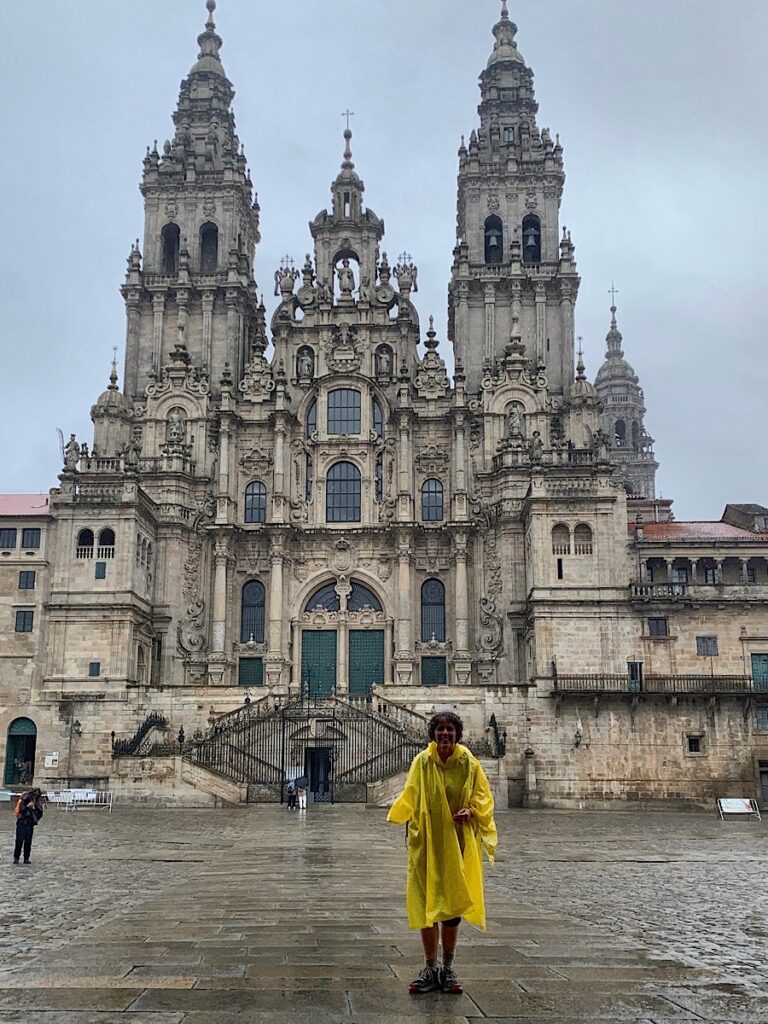 Es ist 10:20 Uhr, als eine junge Deutsche für mich das Foto von mir in meinem gelben Mickey Mouse Poncho vor der berühmten Kathedrale von Santiago de Compostela macht. Der Platz wirkt zu dieser frühen Stunde und aufgrund des schlechten Wetters wie leer gefegt. Erst viel später kommen immer mehr Pilger dazu. Sie lachen, weinen, knien nieder, sei es aus Demut oder weil sie erschöpft sind oder beides, sie beten, sie fallen sich in die Arme oder stehen einfach nur da und schauen in die Richtung der Kathedrale. Letzteres trifft auf mich zu. Ich bin glücklich und stolz, aber auch extrem wehmütig. Gleichzeitig freue ich mich auf die nächsten paar Tage, in denen ich hoffentlich das ein oder andere bekannte Gesicht wiedersehen werde.