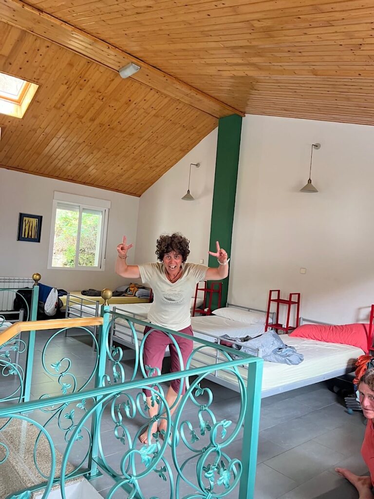 Oben ist es unglaublich gemütlich. Der Schlafsaal ist unter einer Dachschräge, hell und großräumig. Es gibt statt Stockbetten nur Einzelbetten und sogar richtige Bettwäsche aus Stoff!