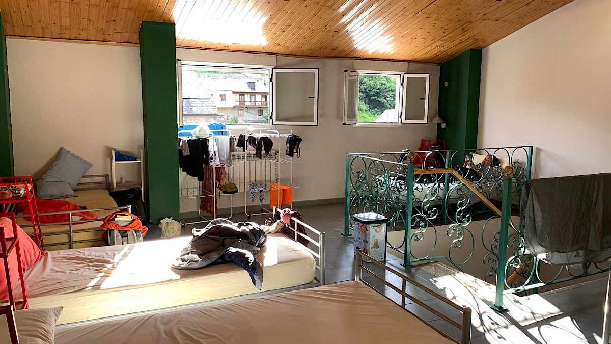 Oben ist es unglaublich gemütlich. Der Schlafsaal ist unter einer Dachschräge, hell und großräumig. Es gibt statt Stockbetten nur Einzelbetten und sogar richtige Bettwäsche aus Stoff!