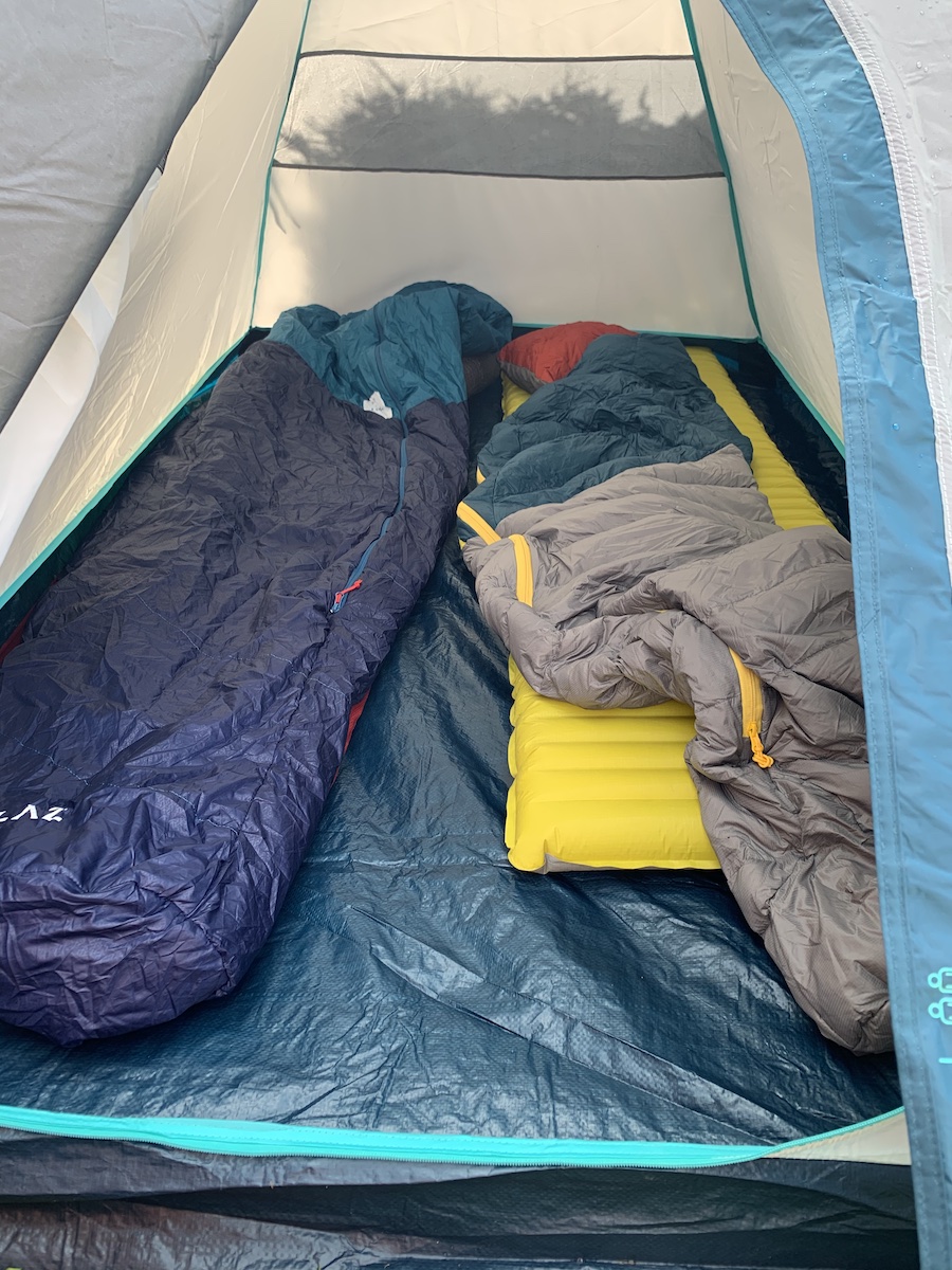Ansonsten ist alles prima, unser Zelt ist winzig, aber wenigstens haben wir ein Dach über dem Kopf. Leider regnet es immer mal wieder. Unsere Taschen haben wir unter einer Plane vor dem Zelt verstaut.