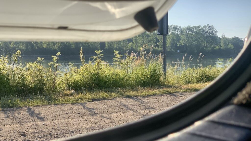 Was habe ich gut und tief geschlafen!! Als es hell wurde und die Singdrossel und der Kuckuck den Tag ankündigten, öffnete ich meine Terrassentür (Heckklappe…) einen Spalt und schaute beim Wachwerden aufs Wasser. Als das erste Schiff vorbei kam, war es für mich Zeit aufzustehen.