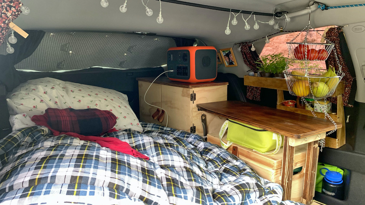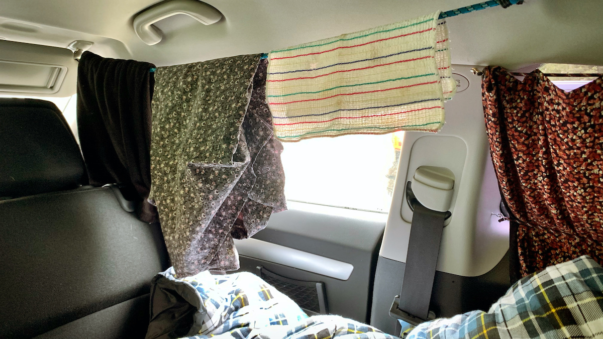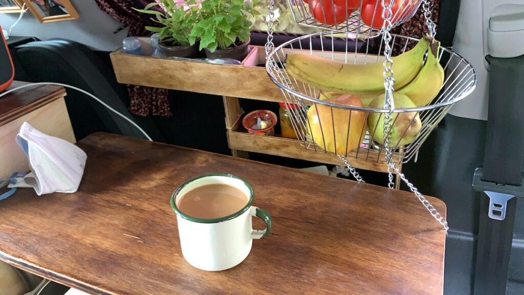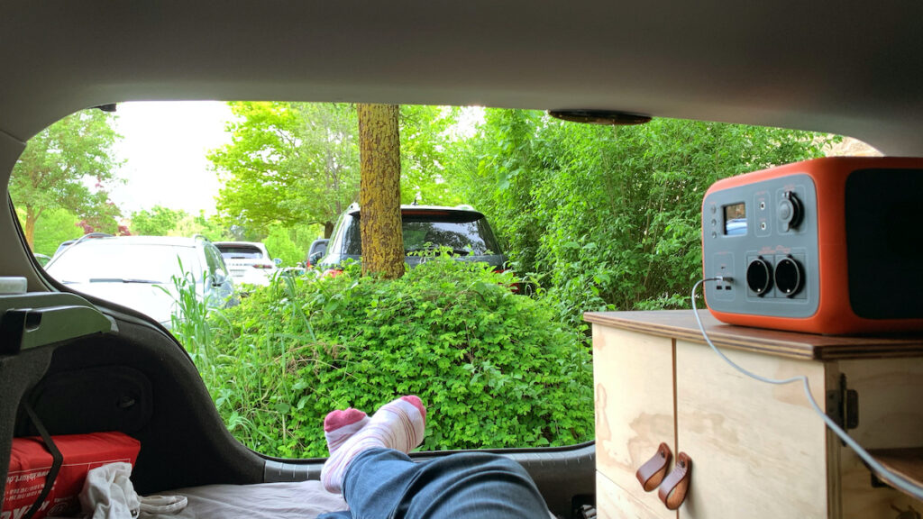 Nach einem deftigen Pfannkuchen und einer Tasse Kaffee ruhe ich mich jetzt etwas am Auto aus und bastel mir eine Wäscheleine 🤔, das Chaos in meiner Tasche macht mich kirre!