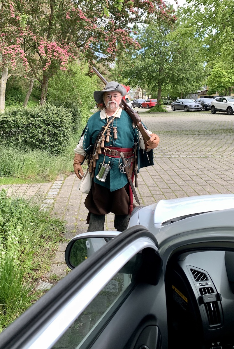 In der Nacht fiel mein Sichtschutz aus Isomatte andauernd von der Heckscheibe, also habe ich bei einer Tasse frisch gebrühten Café erst mal eine Bastelstunde gestartet (ein gut ausgestatteter Camper hat immer ein paar Saugnäpfe dabei…). Da steht plötzlich ein Ritter mit einem Gewehr vor mir. Kein Witz! Er grinst und wundert sich, wie man in so einem kleinen Auto schlafen kann. Ich dachte erst, ich träume!