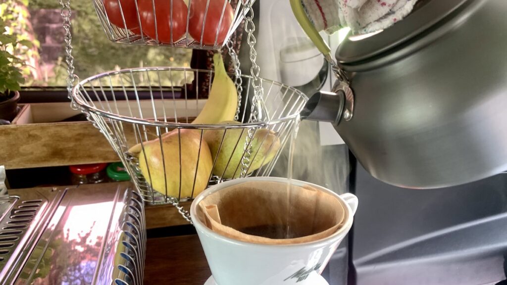 Am Morgen war es allerdings sehr stürmisch, deshalb kochte ich meinen Kaffee heute mal drinnen. Bevor jetzt der gehobene Finger kommt: Ja, ich bin sehr vorsichtig. Die Fenster sind geöffnet, der Abstand zur Flamme ist groß genug (Wärmetest mit der Hand), und das Feuerlöschspray ist immer griffbereit. Aus den Augen lasse ich den Kocher auch niemals!!