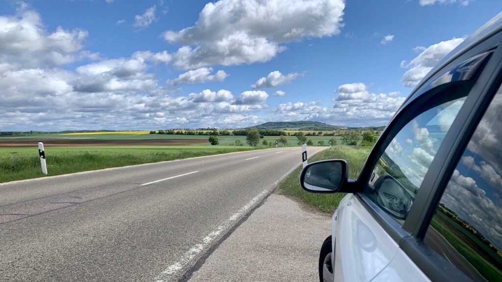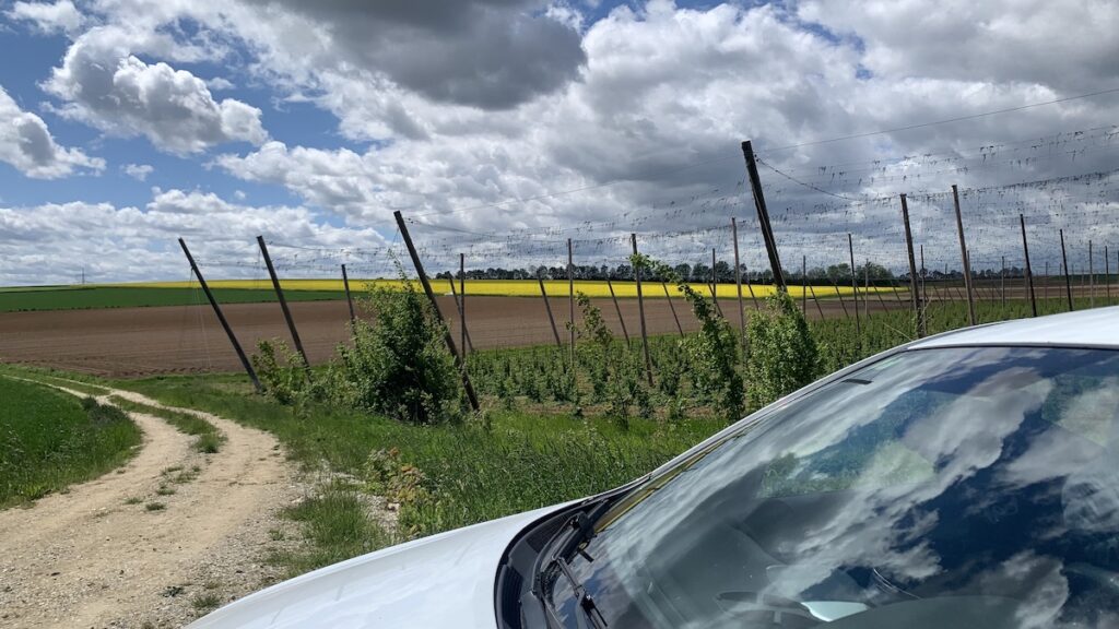 Da ist wohl sowas wie eine Wohnung im Turm über dem Toilettenhäuschen neben mir gewesen, jedenfalls hörte ich gestern und heute die ganze Nacht von dort ein Radio – ohne Ohrstöpsel war an Schlaf nicht zu denken. Umparken wollte ich aber auch nicht, wegen der schönen Hecke, an der ich parkte, und die mich eigentlich beim Kochen schützen sollte……