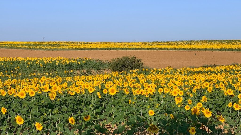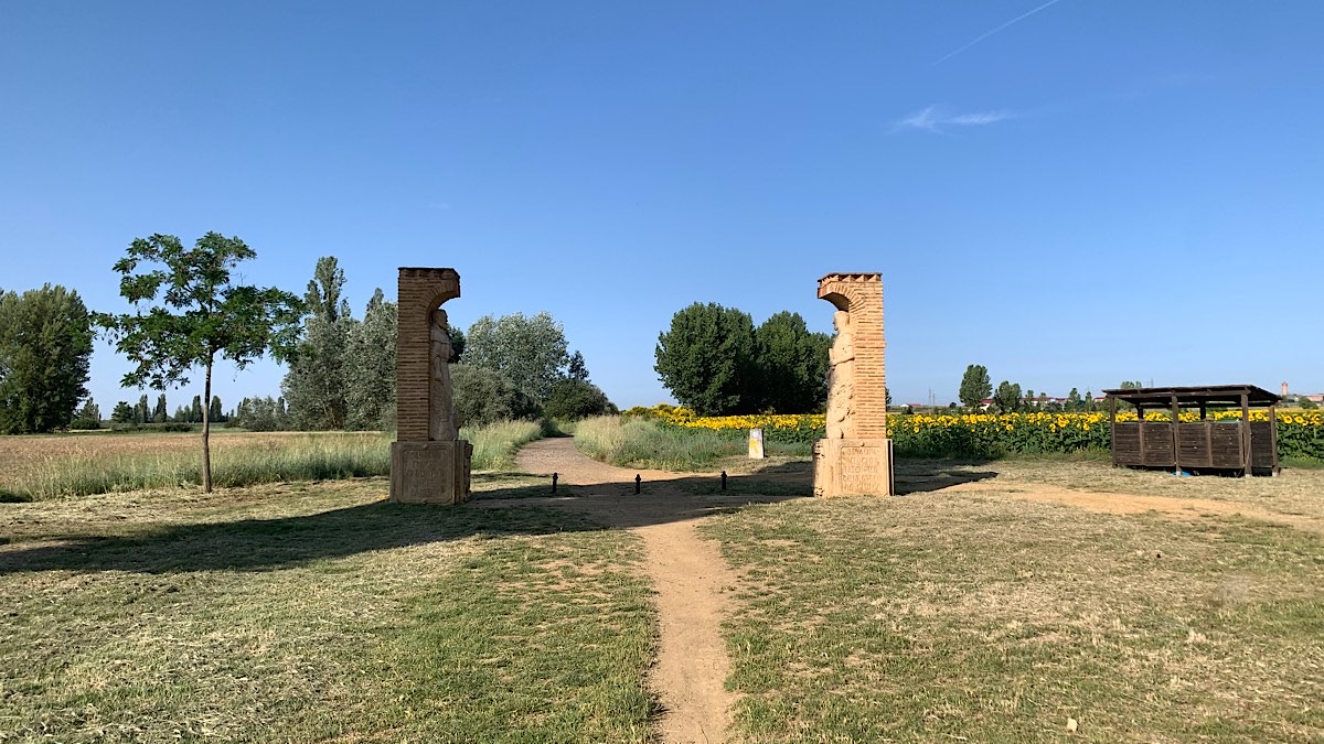 Kurz vor Sahagún ist die offizielle Mitte zwischen Saint-Jean-Pied-de-Port und Santiago de Compostela, das Tor Centro Geografico Del Camino, ich werde es gleich erreichen. Big day. Aber zunächst komme ich an wunderschönen Sonnenblumen-Feldern vorbei, es ist traumhaft.