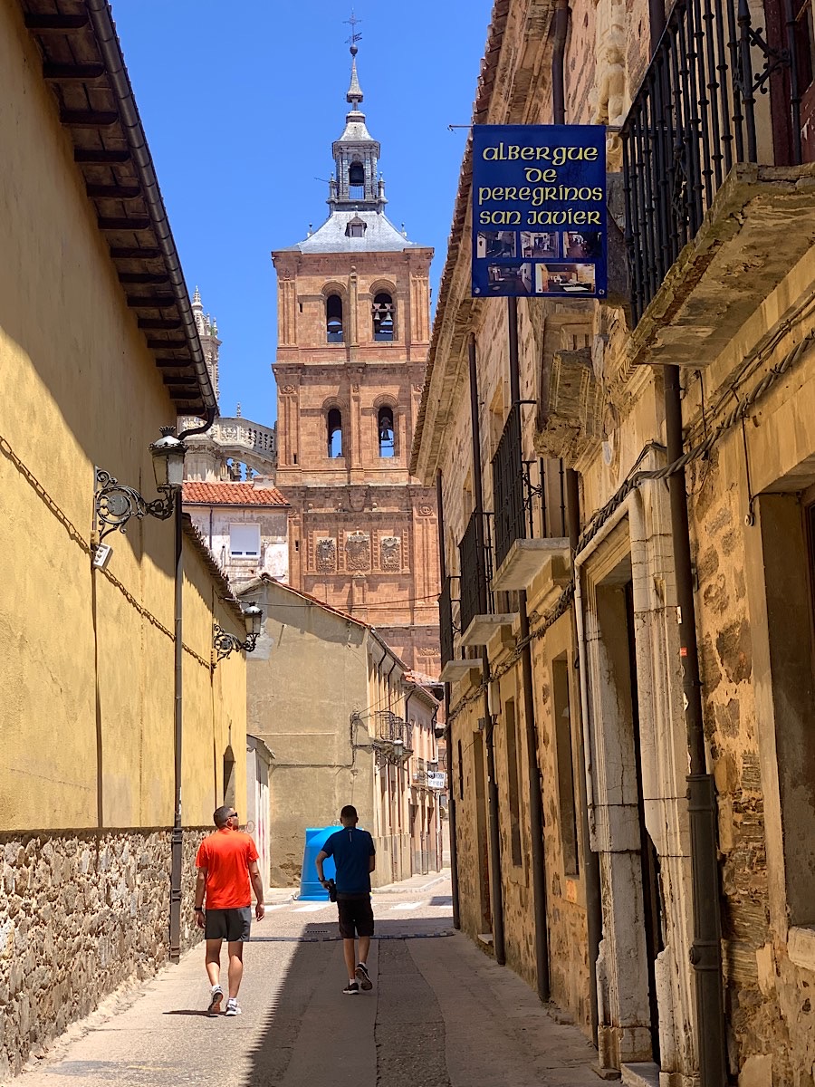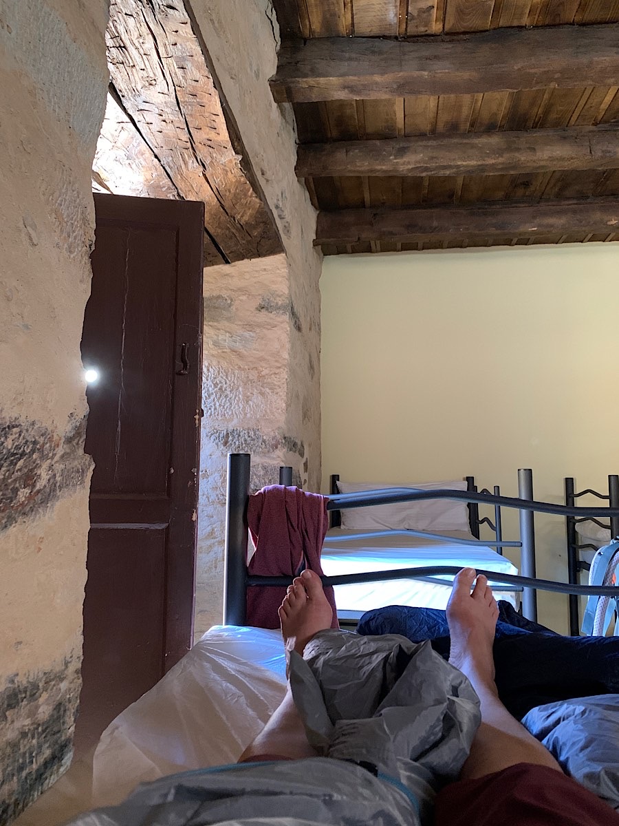 Meine Herberge, ein altes Herrschaftshaus aus dem achtzehnten Jahrhundert, liegt neben der Kathedrale Santa Maria auf der anderen Seite der Stadt. Es gibt eine Küche, in der man sich was kochen kann und eine gemütliche Sitzecke. Der Innenhof wird von trocknender Wäsche verdunkelt, die im ersten Stock auf Wäscheleinen hängen, die von einer Wand zur anderen gespannt sind. Hier oben sind auch die Waschräume und Schlafsäle mit Wänden aus massivem Stein. An einer davon steht das Stockbett, dessen obere Matratze mir zugeteilt wird in einem Zimmer voll mit übergewichtigen Männern, dessen Sprache ich nicht mächtig bin. Ich bin froh neben einem Fenster schlafen zu können, das man öffnen kann, und das werde ich auch, so wahr mir Gott helfe.