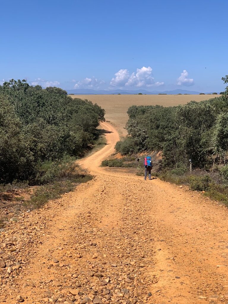 Ich verlasse Villar de Mazarife noch in der Dunkelheit. Und es beginnt direkt am Ortsausgang: Das längste und geradeste Geradeaus, das ich je gesehen habe! Zuerst erkenne ich das Ende der Straße nicht, weil es dunkel ist und später erkenne ich es nicht, weil da keins ist, jedenfalls nicht in den nächsten acht Kilometern. Das muß man sich mal vorstellen, eine asphaltierte Straße, die auf über acht Kilometern total gerade verläuft. Es gibt sicherlich längere, aber sowas zu Fuß zu gehen macht schon was mit einem.