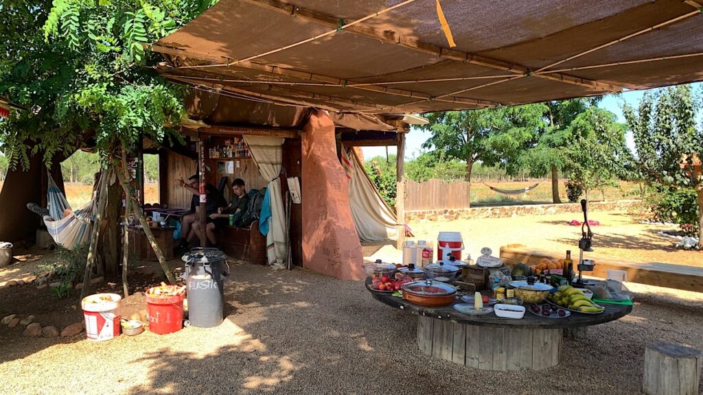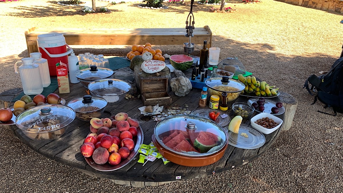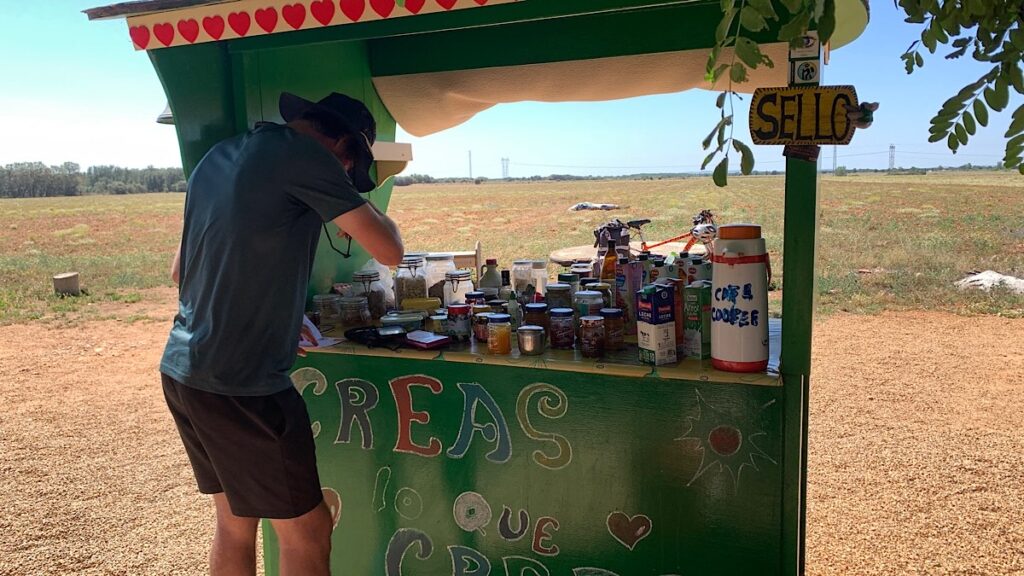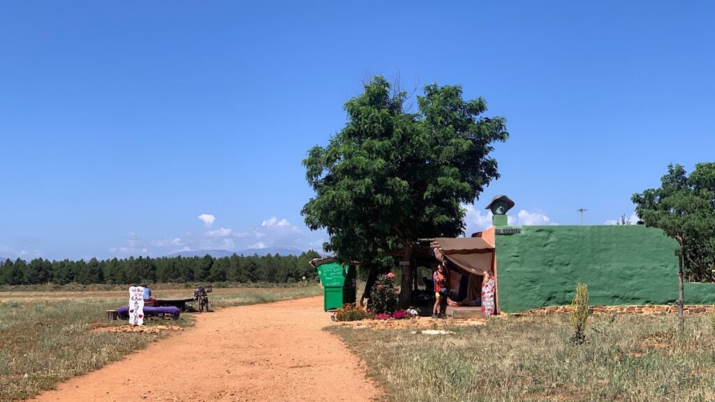 Links und rechts sind weiterhin viele Weizenfelder, wilde Blumen säumen den Wegrand. Ich habe bereits zwanzig Kilometer geschafft, meine Füße tun mäßig weh. Die letzten zehn schaffe ich locker, auch wenn ich nicht mehr so zügig gehe wie heute morgen. Da ist auf einmal mitten im Nirgendwo eine kleine Wohlfühl-Oase. Ein junger Typ hat sich hier niedergelassen und für vorbei kommende Pilger einen urig schönen Aufenthaltsort geschaffen. Es ist fast nicht zu beschreiben, so einladend schön ist es hier. In der Mitte steht ein großer Tisch mit allerhand kleinen Leckereien, wie Wassermelone, Keksen, Säften, Kuchen, Obst, Kartoffelchips und so weiter. Man kann sich nehmen so viel man möchte und gibt dafür eine Spende, die man einfach in die Mitte des Tisches legt. Alles ist so liebevoll hergerichtet mit Hängematten und Bänken unter schattigen Bäumen neben bunt angemalten Bretterbuden, in denen man ausruhen kann. Was ich zu diesem Zeitpunkt natürlich nicht ahnen kann ist, daß vier Stunden nach mir Angela hier eintreffen und die Nacht hier verbringen wird, unter freiem Himmel, nur auf ihrer Isomatte mitten in der Natur. Wie herrlich, hätte ich das gewusst, ich wäre auch hier geblieben. Von Angela erfahre ich später auch, daß der Typ David heißt, hier draußen lebt und die Pilgerspenden sein Unterhalt sind. Das Wasser, das David für sich und die Pilger benötigt holt er von einem Brunnen in ziemlicher Entfernung in großen Kanistern, die er mühsam mehrmals am Tag hier her schleppt.