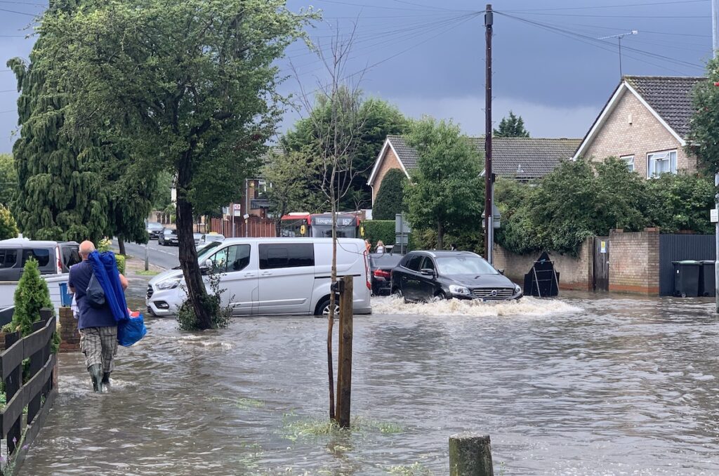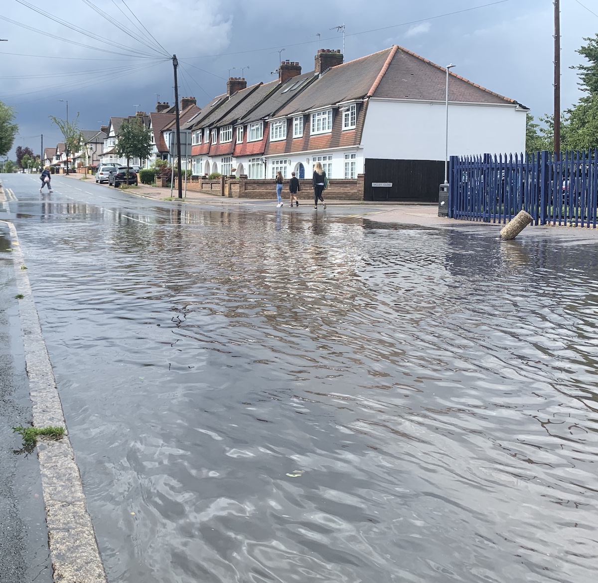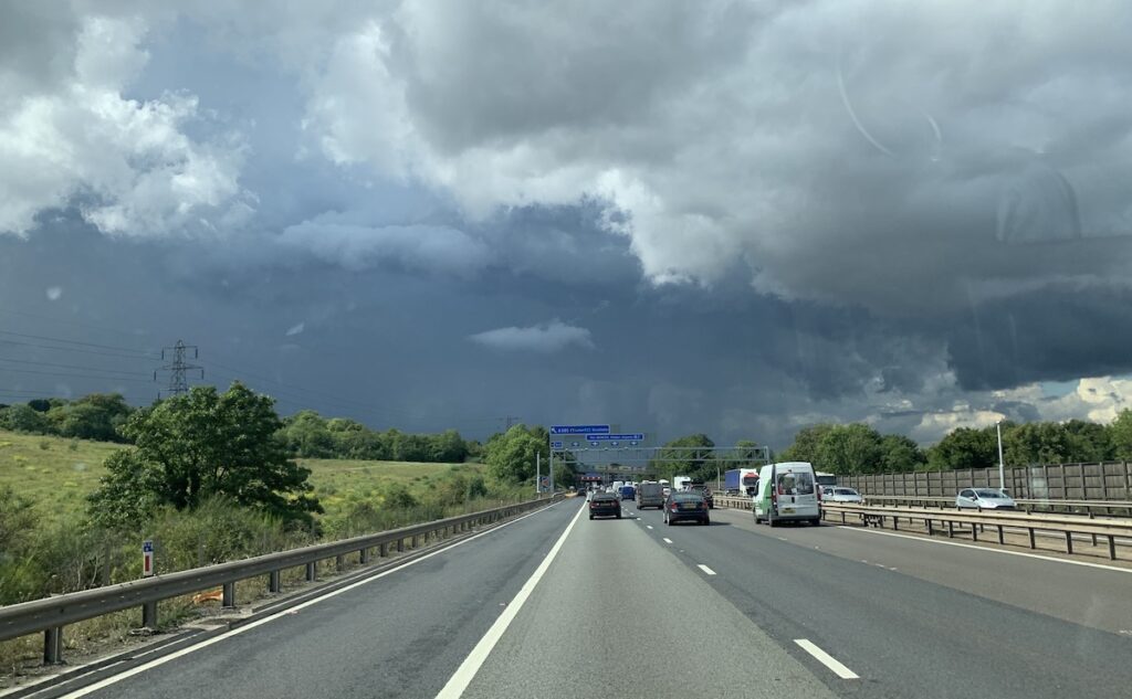 Um jenes Wohnmobil abzuholen, mußten wir mit dem Taxi erst mal nach Waltham Abbey. Das Problem war jedoch, daß kurz vorher ein so heftiges Gewitter tobte, mit Starkregen und Hagel und allem, und in kürzester Zeit unsere Straße komplett überflutet war. Jetzt konnte unser Uber-Taxi uns nicht einsammeln, denn es saß 60 Hausnummern die Straße aufwärts fest, wo eine weitere Überflutung stattfand. So sind wir mit all unserem Gepäck in Gummistiefeln die Straße hoch gewatschelt. Vor uns eine weitere pechschwarze Wolke, die Böses ankündigte.