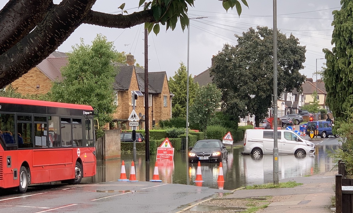 Um jenes Wohnmobil abzuholen, mußten wir mit dem Taxi erst mal nach Waltham Abbey. Das Problem war jedoch, daß kurz vorher ein so heftiges Gewitter tobte, mit Starkregen und Hagel und allem, und in kürzester Zeit unsere Straße komplett überflutet war. Jetzt konnte unser Uber-Taxi uns nicht einsammeln, denn es saß 60 Hausnummern die Straße aufwärts fest, wo eine weitere Überflutung stattfand. So sind wir mit all unserem Gepäck in Gummistiefeln die Straße hoch gewatschelt. Vor uns eine weitere pechschwarze Wolke, die Böses ankündigte.