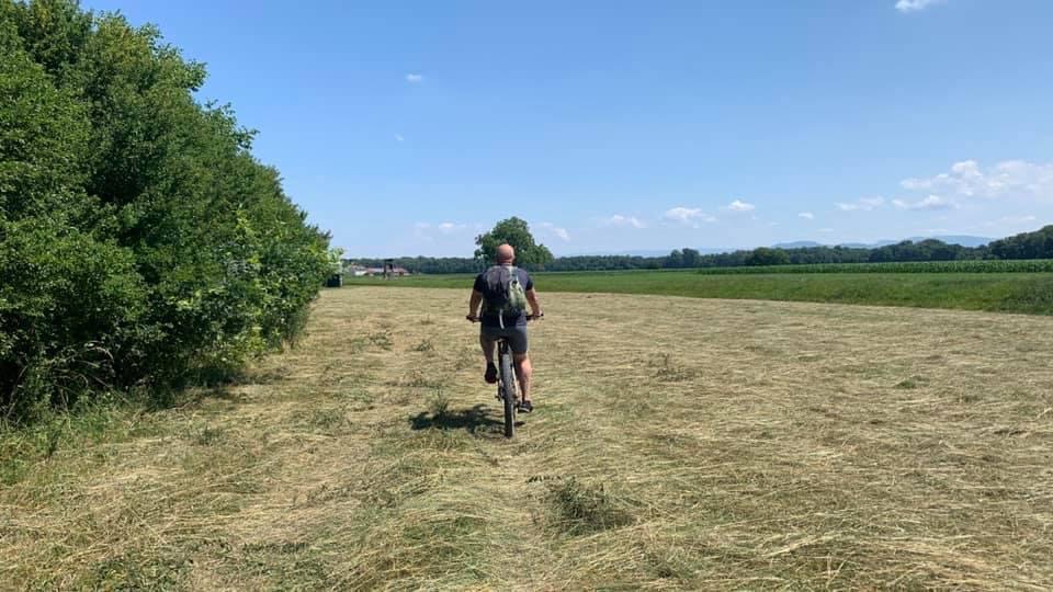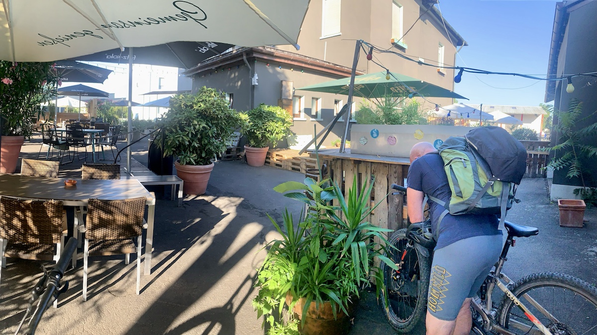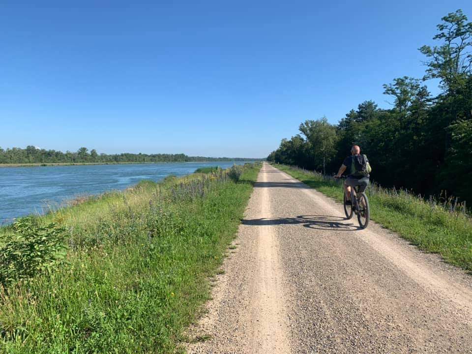 Today our route took us mostly along the Rhein with strong headwinds but occasionally we got some rest bite cycling through woods. The scenery (main river plus lots of overspill ponds) reminded me of Florida. We were expecting alligators at any moment!! The temperature soared to 28 degrees so we were glad if the wind. My head changed a few shades of red however!