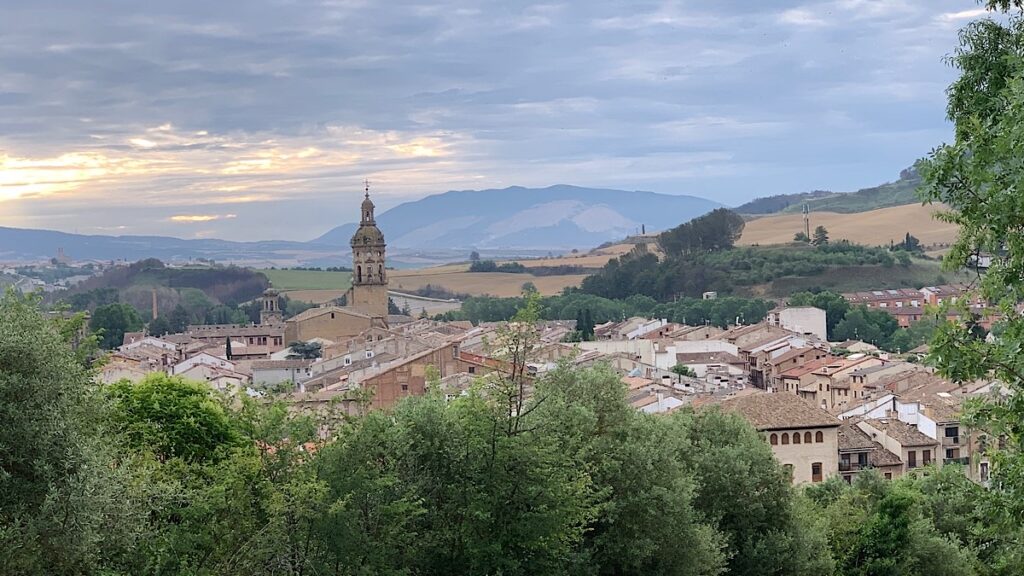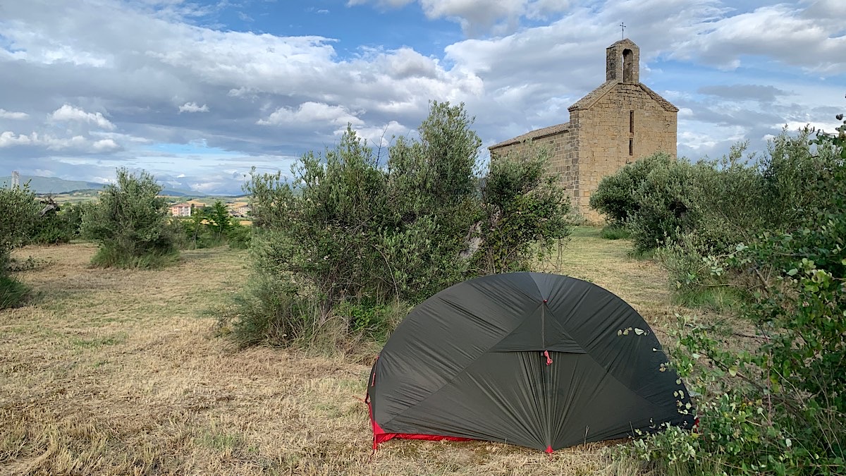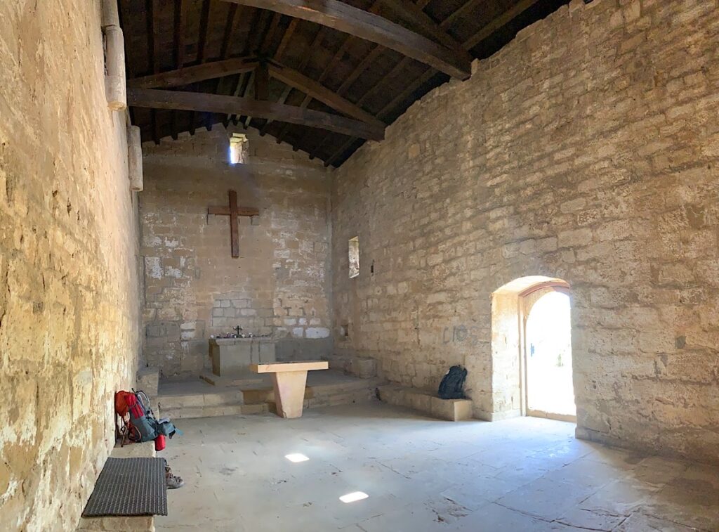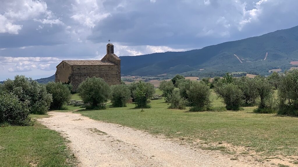 Kurz hinter Villatuerta kommt auf der linken Seite eine Kapelle aus dem zwölften Jahrhundert, die Ermita de San Miguel Arcángel, die dem Erzengel Michael gewidmet ist. Dahinter ist ein Olivenhain und rundherum Büsche auf einer Wiese mit noch mehr vereinzelten Olivenbäumen und ein paar Tischen und Bänken. Ich finde, daß das der perfekte Platz ist, um mein Zelt aufzuschlagen. Es ist halt nur noch zu früh und auch zu heiß, deshalb gehe ich ins Innere der Kapelle und lege mich auf die Steinbank, da ist es schön still und kühl.