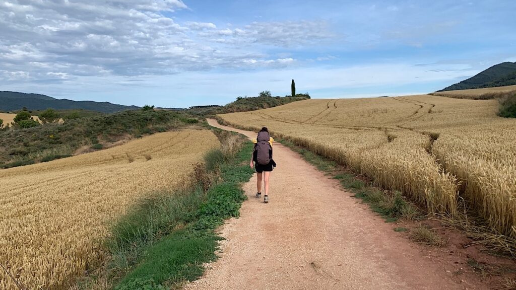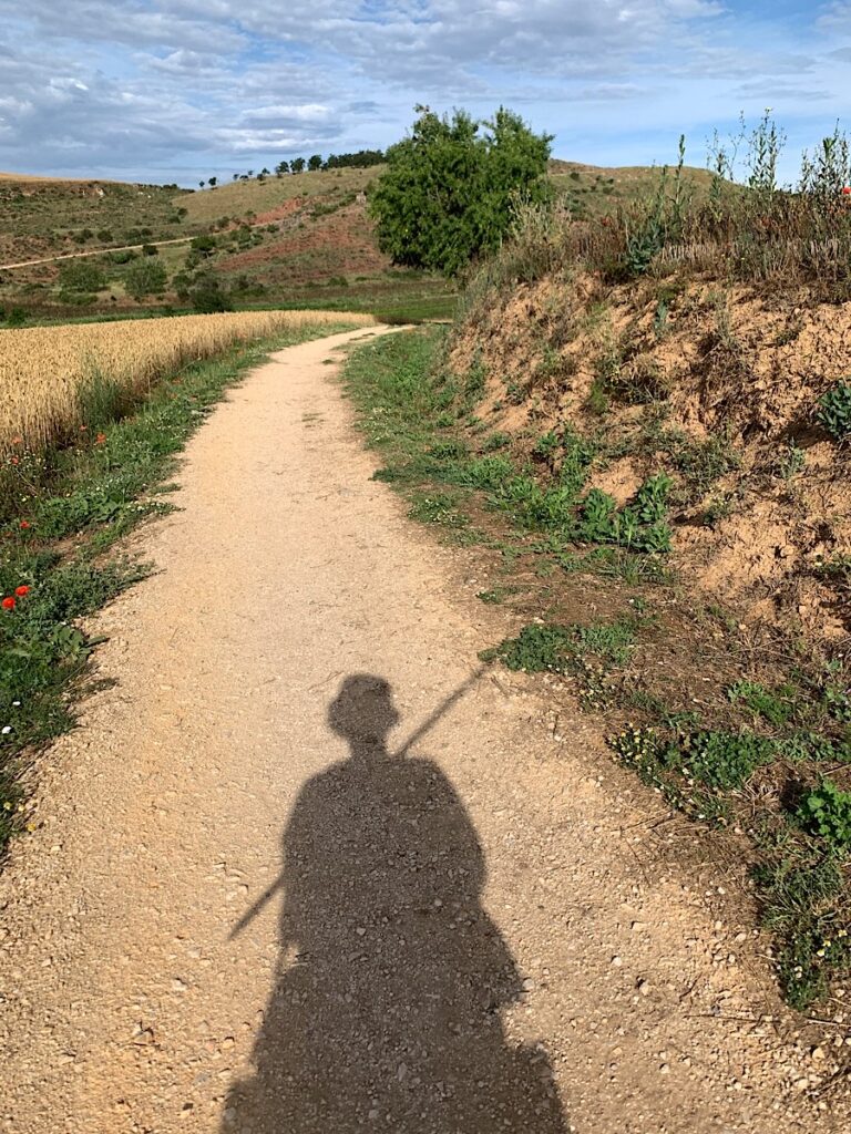 Ich verlasse die Herberge eine halbe Stunde später. Als ich gerade den Hügel runter laufe, sehe ich just in dem Moment den nervigen Richard über die Flussbrücke kommen. Ich verharre in Schockstarre und hoffe, daß er mich nicht sieht, aber es ist bereits zu spät. Seine Zahnspange blitzt unter seinem breiten Grinsen, als er mir seine Ghettofaust zur Begrüßung entgegen streckt. Jetzt bleibt mir nichts anderes übrig, als eine Weile neben ihm her zu laufen, und tatsächlich wird daraus eine ganze Stunde. Richard ist eigentlich ein feiner Kerl, nur halt sehr laut und irgendwie auffällig, irgendwas stimmt nicht mit ihm. Schliesslich erkläre ich ihm, daß ich ab jetzt langsamer laufen werde, weil ich nicht möchte, daß meine Po Schmerzen wieder kommen. Tun sie auch nicht, stattdessen sind es heute die Füße. Es ist schon seltsam, da laufe ich etliche Touren mit diesen Wanderschuhen, und nie habe ich Probleme mit ihnen gehabt. Jetzt bekomme ich plötzlich Blasen und schmerzende Füße. Das kann nur am Rucksack liegen, am Humpeln und an den geschwollenen Füßen durch die vielen Kilometer jeden Tag und an allem zusammen.