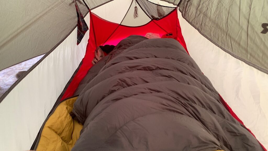 Mir wird die Kapelle dann irgendwann doch zu kalt und auch zu hart, deshalb beschließe ich mein Zelt jetzt schon aufzuschlagen, außer Vadim ist ja niemand hier. Mit dem starken Wind hier oben ist das Aufbauen allerdings eine echte Herausforderung, und da das Zelt so federleicht ist, fliegt es mir fast davon. Die Heringe halten nur schlecht in dem harten Boden, aber am Ende habe ich mein Heim fixiert und hieve all mein Zeug hinein. Jetzt kann es in keinem Fall mehr weg fliegen.