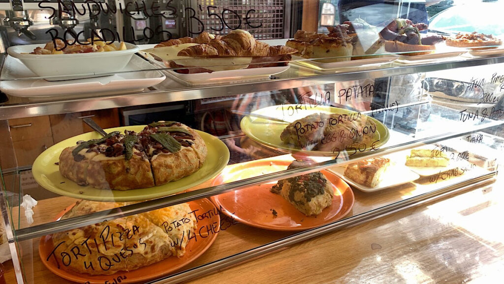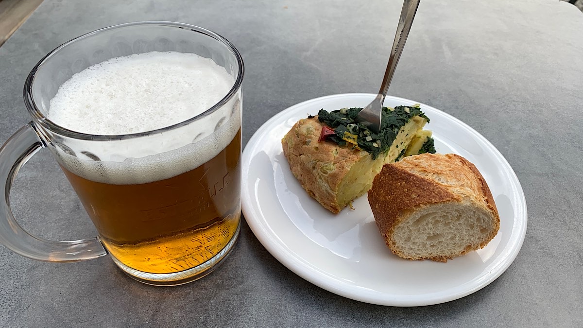 Mein Hunger ist riesig, deshalb gehe ich direkt in die Bar gegenüber. Die Auswahl an Essen ist allerdings eher dürftig, außer Tortillas, Tapas und Bocadillos gibt es nichts, dabei hätte ich jetzt so gerne was richtig deftiges wie einen Teller mit Fleisch, Gemüse und Kartoffeln, oder sowas. Stattdessen gibt es halt ein Stück Tortilla und ein großes Bier.