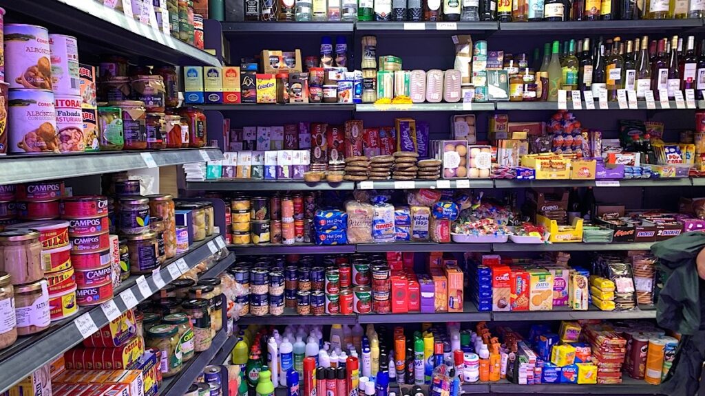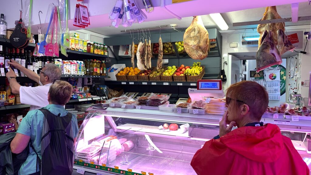 Für etwas Obst und Kekse für morgen besuche ich den Supermarkt nebenan. Hier gibt es alles was das Pilgerherz begehrt, sogar abgepackte Wurstscheiben und von der Decke baumelnden Schinken.
