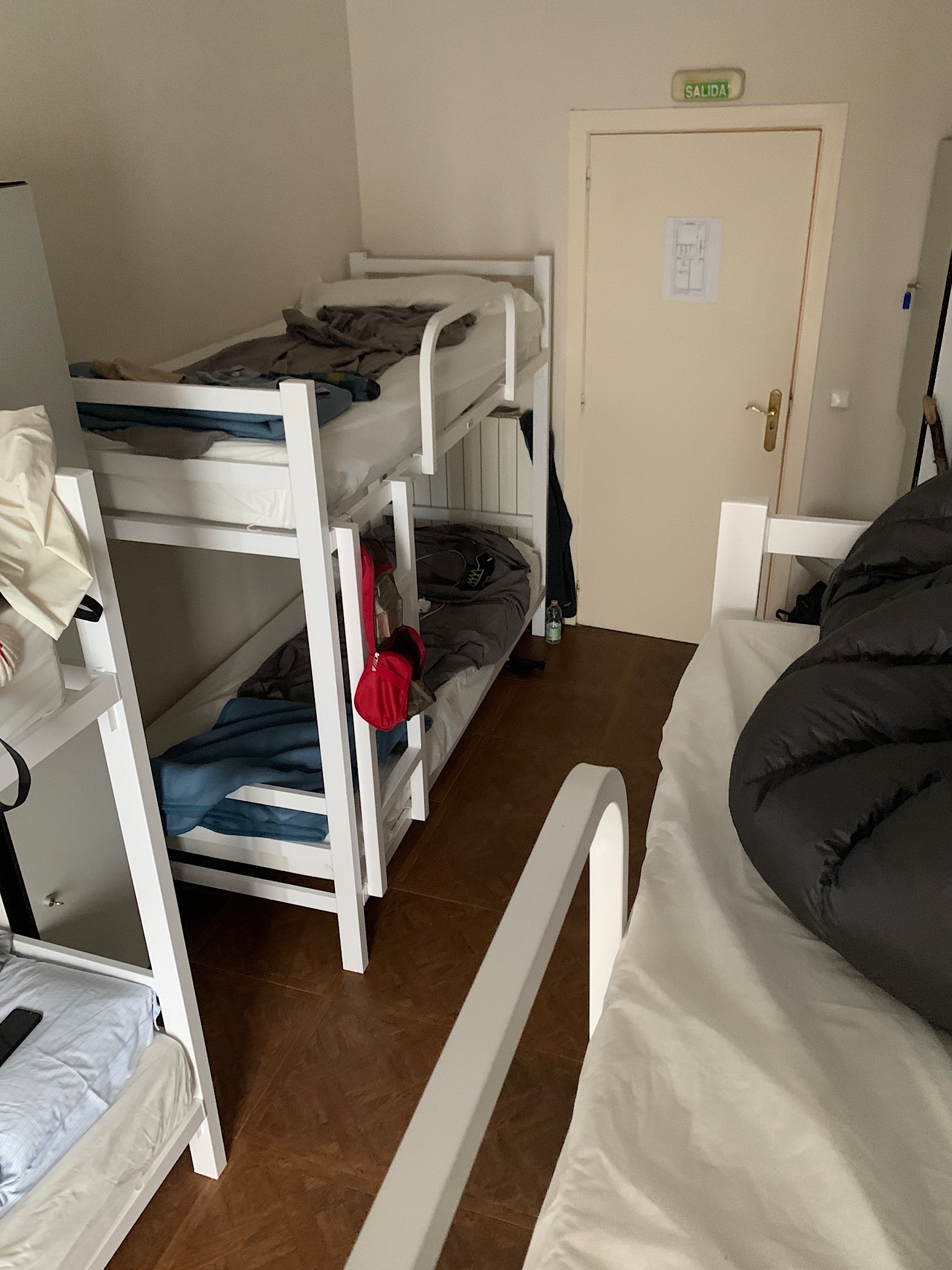 Ein Pilger liegt erschöpft in seinem Bett, und ich versuche keinen Lärm zu machen, als ich meine Matratze beziehe. Das ist gar nicht so einfach, denn ich muß praktisch auf der Matratze sitzen, während ich das Spannbettlaken aufziehe, denn sonst komme ich ja gar nicht an die Ecken ran! Außerdem sind das Laken und der Kopfkissenbezug aus einer Art Papier, und ich befürchte, daß es zerreißt, wenn ich zu sehr daran zupfe. Und überhaupt, schon mal mit wundgelaufenen Füßen die dünnen Metallsprossen einer Leiter eines Etagenbetts hochgestiegen?