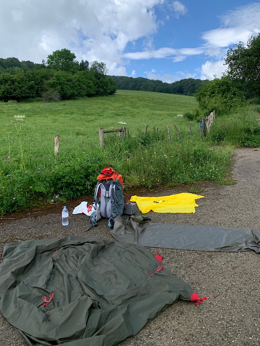 Alles ist klamm, als ich morgens wach werde. Ganz dicht an meinem Zelt gibt eine Amsel ihr nüchternes Potpourri von Tonfolgen zum besten, so wie ich es von einem Singvogel dieser Art noch nie gehört habe. Während ich mich ebenso pfeifend aus meinem Schlafsack pelle in der Hoffnung die Amsel zu motivieren mal was anderes zu versuchen, fängt es leicht an zu regnen. Ich möchte aber nichts auf die nasse Wiese legen, deshalb trage ich meine Sachen in den Wald, wo es noch relativ trocken ist und sortiere mich dort in Ruhe. Am Himmel stehen dunkle Wolken, und ich muß an Andrew und Aki denken, die heute bei diesem Wetter über die Pyrenäen müssen.