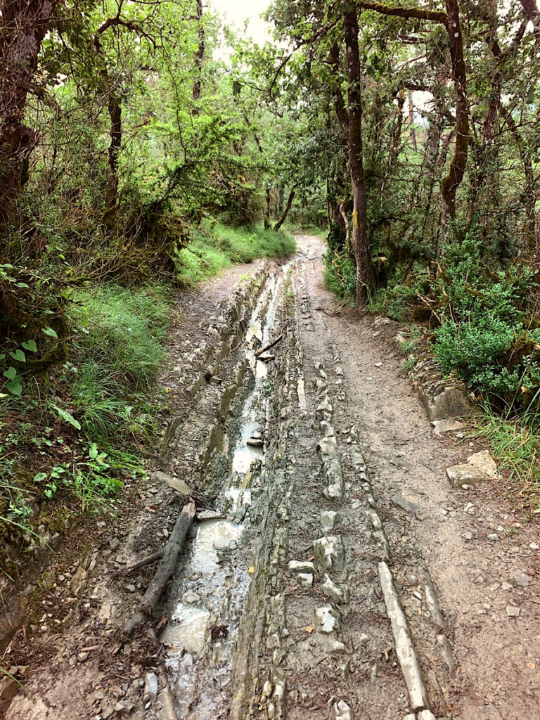 Später kommt die Sonne kurz raus, und ich nutze die Gelegenheit mein nasses Zelt auf dem Boden auszubreiten, um es zu trocknen. Der Regen hat alles matschig gemacht, überall sind Pfützen. Die Wege sind jetzt obendrein oft unbefestigt, voller Geröll, und stellenweise tun sich tiefe Steinfurchen vor mir auf. Und meine Füße tun mir so weh!