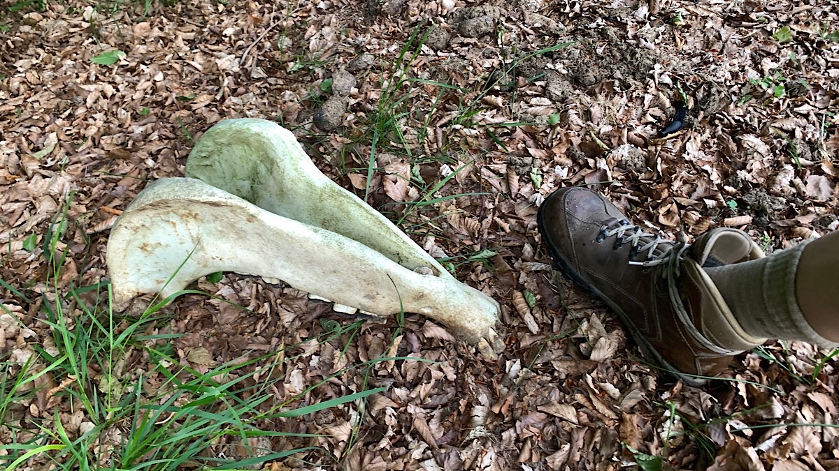 Es ist noch nicht dunkel, als ich schlafen gehe. Die Grillen zirpen, und ein wenig unheimlich ist es schon. Angst habe ich keine, es ist nur alles so neu. Als ich mich im Wald für die Nacht fertig mache, entdecke ich beim Pieseln den Kieferknochen eines Pferdes. Ich kann nur hoffen, daß das Tier an Altersschwäche gestorben ist und nicht durch Wölfe, oder so. In diesem Sinne, gute Nacht.