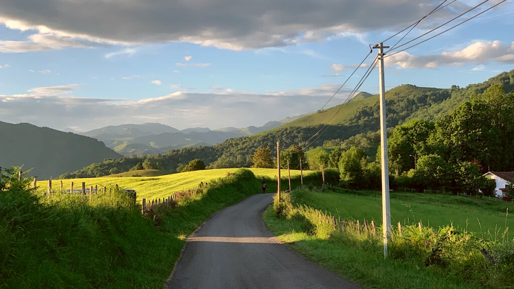 Direkt als ich die Hauptgasse von Saint-Jean-Pied-de-Port hinter mir lasse, geht der Weg auf einer asphaltierten Straße steil bergauf. Es ist herrlich ruhig. Die aufgehende Sonne taucht die schöne Landschaft in ein warmes Licht, die Vögel zwitschern und die Hähne krähen. Genau so habe ich es mir vorgestellt. Erstaunlicherweise sehe ich nur wenige Pilger, die zwar im Laufe des Tages immer mehr werden, die Massen sich aber wirklich in Grenzen halten.