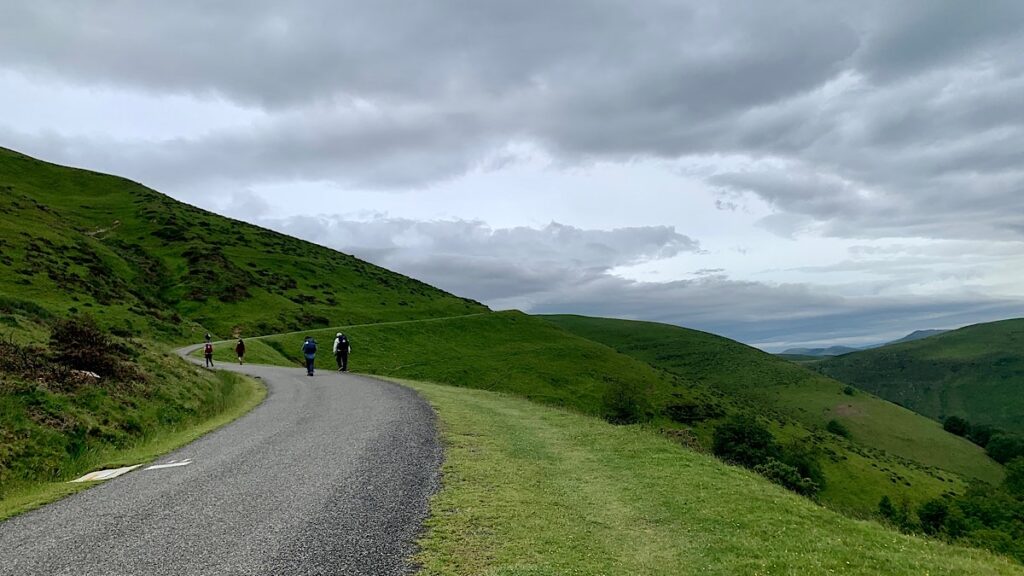 An einer Stelle, an der der Weg sich windet, setze ich mich an einen großen Stein gelehnt in die Nähe eines Hanges und mache Rast. Da kommt Andrew winkend den Hügel hinauf. Er und auch Aki haben im Vorfeld für heute Nacht ein Bett in der nur acht Kilometer entfernten Refuge Orisson gebucht, da sie am ersten Tag nicht gleich so viele Kilometer abreißen wollen. Bis dorthin ist es von hier aus gar nicht mehr so weit, ganz zu Andrews Bedauern, denn er möchte am liebsten heute noch weiter gehen.