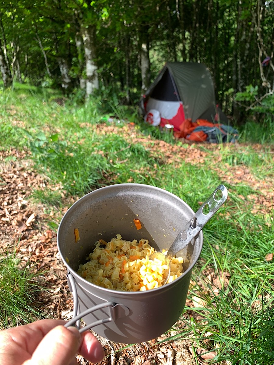 Als alles fertig aufgebaut ist, koche ich mir im Windschatten meines Zeltes ein paar Tütennudeln. Nicht besonders nahrhaft, aber ich werde morgen schon dafür sorgen was richtiges zwischen die Zähne zu bekommen. Jetzt bin ich einfach nur erschöpft und müde. Ich schnabuliere meine Nudeln etwas weiter abseits auf der Wiese und stelle fest, daß es hier viel windstiller und auch viel schöner und heller ist, als da drüben am Waldrand. Hier ist auch ein Gebüsch, das mein Zelt mit Sicherheit verdeckt, so daß ich von der Straße aus nicht gesehen werde. Kurzerhand löse ich die Heringe und trage das zusammengebaute Zelt an meinen neuen Platz. Ja, so ist es besser. Und es ist wirklich prima verdeckt durch das Gebüsch.