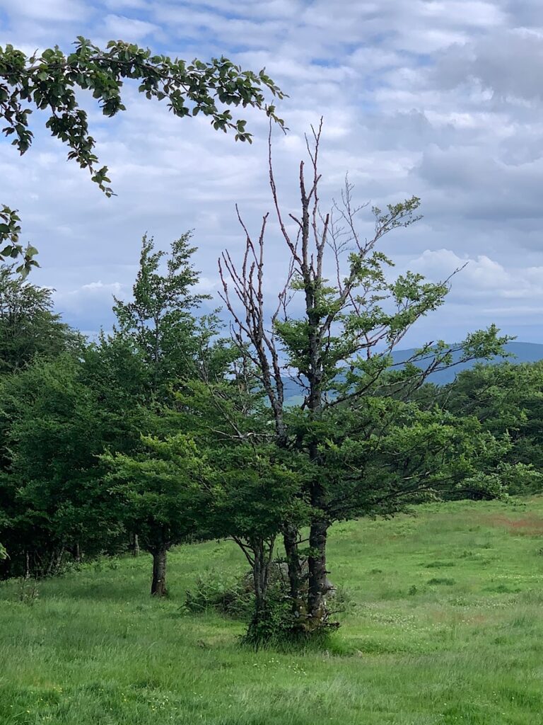 Ich fühle mich wohl in Andrews and Akis Gesellschaft und wäre gerne geblieben, aber ich möchte heute noch Spanien erreichen. Wie sich das anhört. Aber es stimmt, Roncesvalles liegt bereits in Spanien, und zwar in der Region Navarra im Baskenland. Irgendwo dort muß ich später auch einen Platz finden, wo ich unauffällig mein Zelt aufbauen kann. In Spanien ist das Wildcampen verboten, wird aber entlang des Jakobsweg gedultet, solange man sich an bestimmte Regeln hält, die da wären: Das Zelt nach Sonnenuntergang aufbauen und vor Sonnenaufgang wieder abbauen. Nicht sichtbar am Weg zelten aufgrund von visueller Verschmutzung, nicht auf privatem Land oder in einem Naturschutzgebiet, kein Feuer machen und keinen Müll hinterlassen. Ich glaube, das war alles.