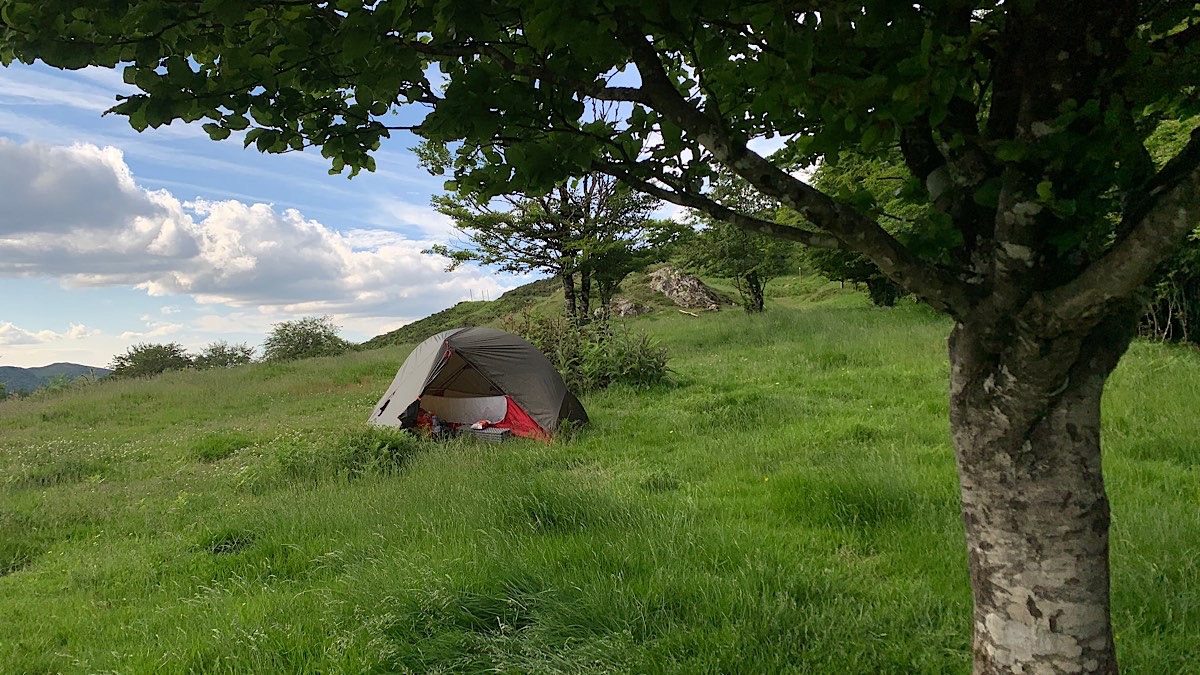 Kurz vor der Stadt komme ich an einem Hang mit Wildpferden vorbei, und dahinter ist ein Waldstück mit einer etwas abschüssigen Wiese davor. Hier sind kleine Schutzbunker in den Boden gebaut, es sieht fast so aus wie im Auenland von Herr der Ringe. Mir gefällt es hier, und ich beschließe mein Zelt genau hier am Waldrand aufzubauen. Der Boden ist allerdings etwas uneben, deshalb schiebe ich das umherliegende Laub so zusammen, daß es eine weiche gleichmäßige Fläche bildet. Nicht weit hinter mir weht der Wind böig einen Abhang herauf, so sehr, daß ich das Zelt abspannen muß.