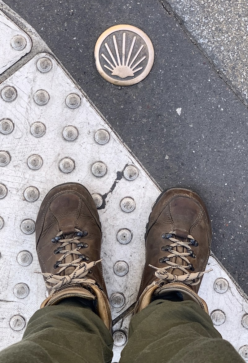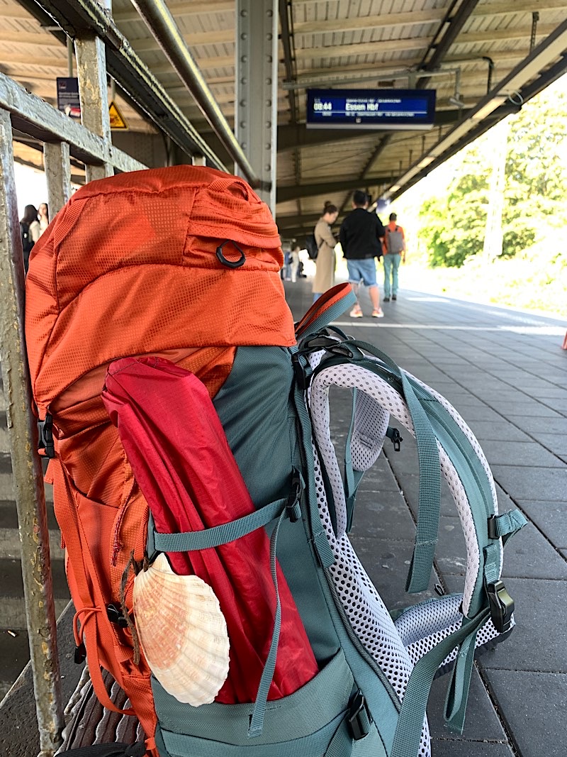 Als ich schließlich am Morgen des 06. Juni meinen Rucksack schultere und die Tür hinter mir zu ziehe, fühlen sich meine Beine an wie Pudding. Meine Hände sind klitschnass, und mir ist schlecht, als ich im Bus zum Bahnhof sitze. Ich habe das Gefühl jeder starrt mich an, und ich frage mich, wieviele Leute eigentlich die Jakobsmuschel an meinem Rucksack wahrnehmen und wissen, was es damit auf sich hat. Ehrlich gesagt, wusste ich es bis vor Kurzem auch nicht, aber die Muschel gilt als Zeichen der Pilger, die auf dem Weg nach Santiago de Compostela unterwegs sind, wo sich das Grab des Heiligen Jakobus befindet, dem Schutzpatron der Pilger. Ich habe mir gedacht, auch wenn ich nicht pilgere im Sinne von religiösen Gründen, vielleicht sollte ich trotzdem so eine Muschel an meinen Rucksack binden. Und weil mein Mann David grundsätzlich nichts wegschmeißt, besitzt er auch noch ein paar Jakobsmuscheln seines letzten Muschelmahls, von denen er eine für mich mit Liebe opfert.