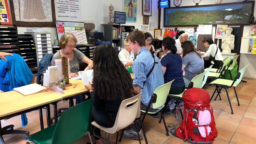 In Saint-Jean-Pied-de-Port gehen wir direkt zum Pilgerbüro. Hier bekommen die Pilger ihren Credential, den Pilgerpass, in dem sie ab jetzt idealerweise täglich Stempel sammeln, um am Ende beweisen zu können, daß sie den Weg tatsächlich gegangen sind. Wirklich wichtig sind allerdings nur die letzten einhundert Kilometer, um am Ende der Pilgerfahrt in Santiago ihre Urkunde, die Compostela entgegen nehmen zu können.