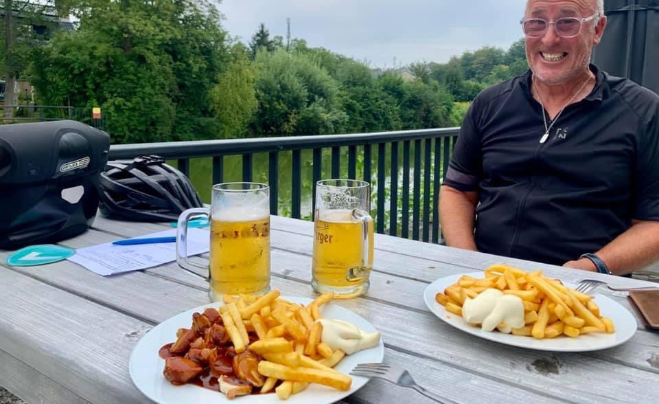 In Flaesheim half unsere Lieblingsbäckerei mit einem guten Kaffee, und schließlich ging es am Kanal entlang und querfeldein an Datteln vorbei Richtung Inselterassen. Der Koch öffnete für uns früher als vorgesehen und wir bekamen das beste Ruhrpott Frühstück: Currywurst mit Pommes und Mayo und ein Bier 🍺😜.