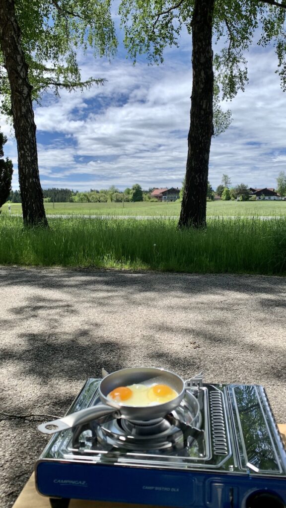 In Haunzenbergersöll sah ich das erste Mal die Alpen in der Ferne 😍. In der Ortschaft Hammer kaufte ich vom Bauern ein paar Eier, die ich mir am Waldrand in Bayrisch Gmain in die Pfanne schlug.