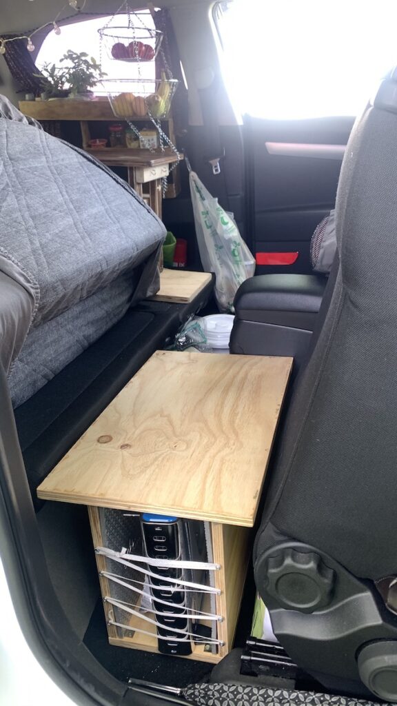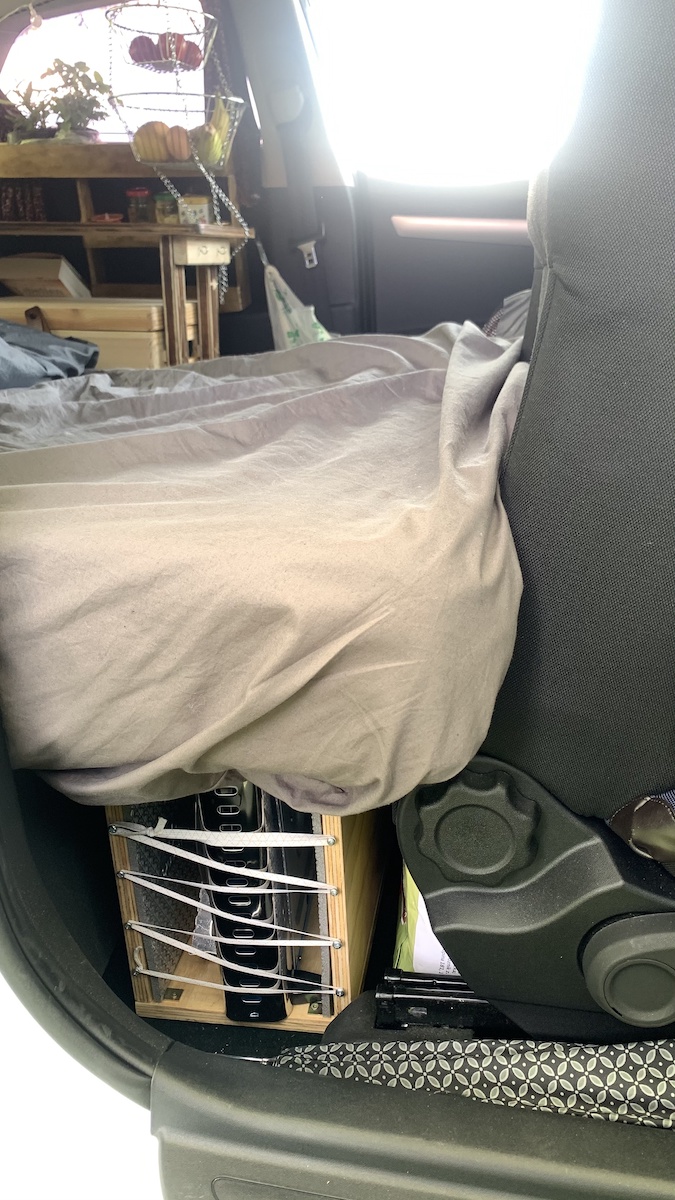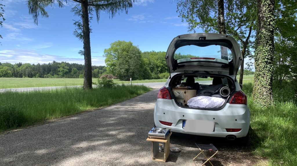 Also ich muss schon sagen, ich lerne gerade auf hartem, wenn auch sehr schönem Weg, mich bestens zu organisieren. Alles ist mit rumkramen und hin- und herräumen verbunden. „Mal eben“ geht im Micro Camper nicht 😆. ZB dient mein Tisch auch gleichzeitig als Kopfstütze für meine Matratze. Und in diesem Tisch habe ich den Kocher verstaut. Eine Seite der Tischplatte ist nun als „Küche“ markiert, soll heißen, diese Seite nicht für die Matratze benutzen, wegen der Fettspritzer beim Braten. Heute erst gelernt. Hab das mal anhand einer Fotoreihe festgehalten…