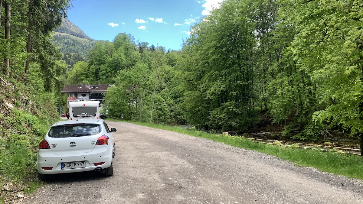 Und hier bin ich nun, am schönen Königssee! Ich habe so ein Glück mit meinem Parkplatz, der liegt nämlich etwas versteckt von all den Massenparkplätzen direkt an einem Fluß! Ein paar Wohnmobile parken noch hier, und das war‘s.